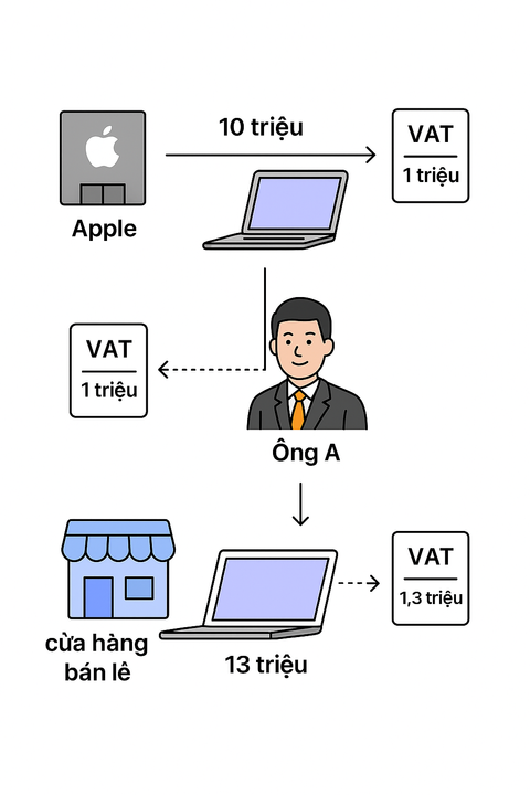 Ông A là nhà phân phối quyết định bán lại chiếc MacBook cho một cửa hàng tư nhân chuyên bán đồ điện tử với giá 13 triệu để ăn chênh lệch lãi 2 triệu. Vẫn áp dụng mức thuế suất kể trên, ta có được tiền thuế 10% trong giao dịch này là 1,3 triệu, tổng số tiền cửa hàng phải bỏ ra để có được chiếc MacBook là 14,3 triệu.