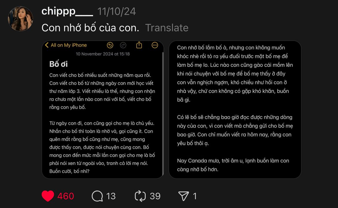 Con đã không còn ngại viết cho bố những bức thư bảo con nhớ bố nữa. Chả ngại nhắn tin bảo "bố ơi con nhớ bố".