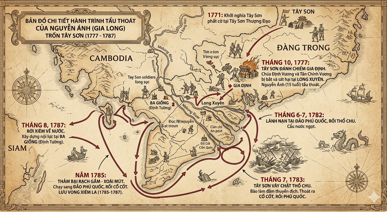 "Cuộc tấn công của quân Tây Sơn vào năm Đinh Dậu (1777) đã khiến cả Chúa Định Vương Nguyễn Phúc Thuần và Tân Chính Vương Nguyễn Phúc Dương đều bị bắt và sát hại. Gần như toàn bộ thành viên cao cấp, những nhân sự cốt lõi của "tập đoàn phong kiến" chúa Nguyễn ở Đàng Trong đều bị hành quyết. Nguyễn Ánh khi ấy mới 15 tuổi là người duy nhất trong hàng vương thất may mắn thoát chết giữa vòng vây dày đặc, bắt đầu một cuộc hành trình "tái cấu trúc từ đống tro tàn" kéo dài ròng rã 25 năm."