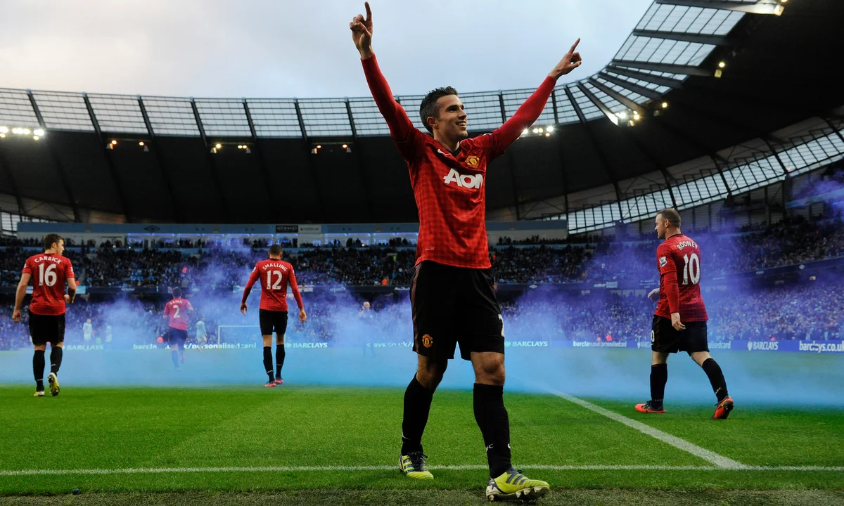 Nếu phải chọn một khoảnh khắc đánh dấu sự chuyển giao quyền lực trở lại với màu Đỏ, đó chính là trận Derby Manchester tháng 12/2012 tại Etihad. Tỷ số đang là 2-2 ở phút bù giờ. Van Persie đứng trước quả phạt trực tiếp. Thay vì một cú sút búa bổ, anh vẽ một đường cong hiểm hóc, bóng khẽ chạm hàng rào đổi hướng và bay vào lưới. Khoảnh khắc ấy, anh chạy về phía khán đài sân khách, gào thét trong sung sướng. Bàn thắng đó chấm dứt chuỗi bất bại sân nhà của Man City, nới rộng khoảng cách điểm số và quan trọng hơn, nó bẻ gãy ý chí của gã hàng xóm ồn ào. Đó là lúc người ta biết: Chức vô địch không thể tuột khỏi tay MU được nữa.
