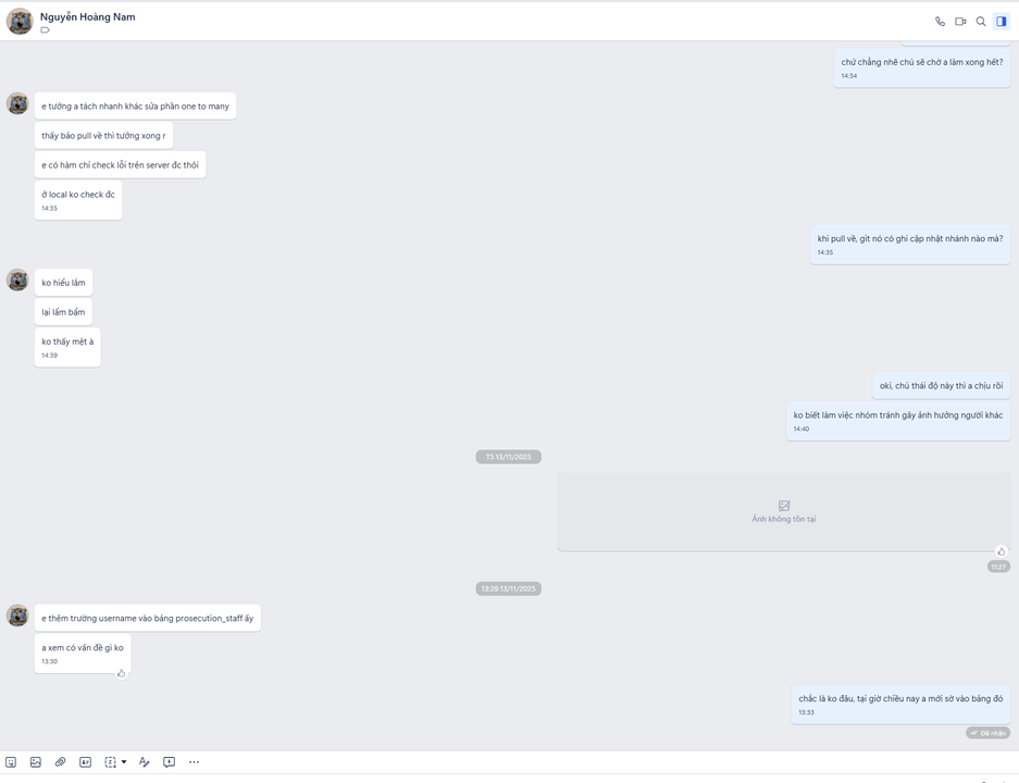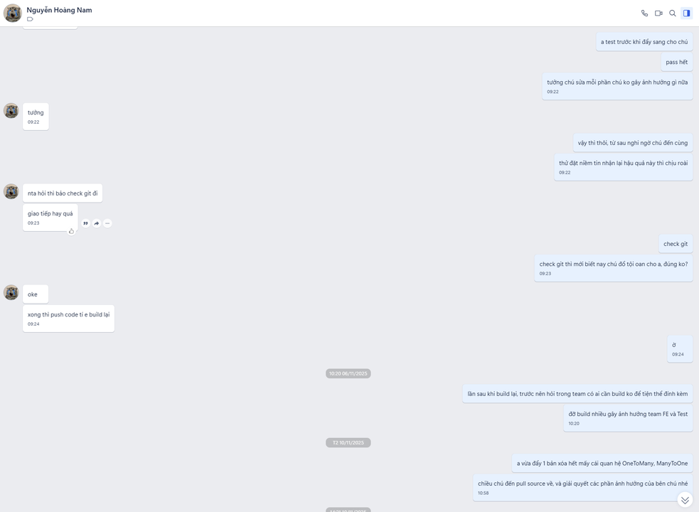 - Môi trường phát triển thiếu thốn: dự án mình làm chỉ có 1 nhánh dev trong khi thường sẽ có thêm nhánh uat hay product nữa, thành ra ai gây lỗi là cả team tắc. Điển hình mấy hôm trước, bên data dùng chung của 1 team ở công ty khác làm, sửa trộm không thông báo gì cả khiến cho 3 team bên này chết hết, data cũ không dùng được, lại phải đi đồng bộ lại, cả BE lẫn FE lại đi map lại các trường hết. Hix hix