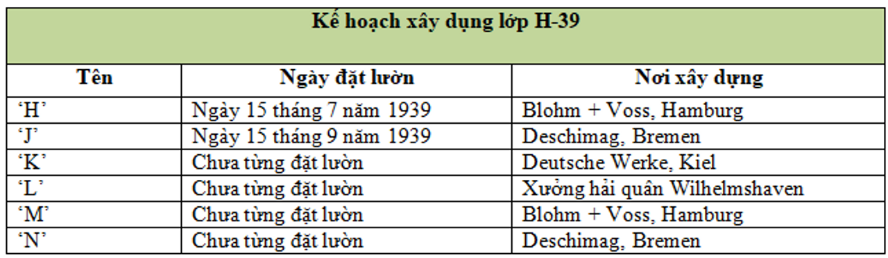 Việc hoàn tất lớp H trong vòng sáu năm dựa trên giả định rằng Hải quân Đức sẽ không tham chiến cho đến năm 1946. Ngay sau khi chiến tranh bắt đầu vào ngày 1 tháng 9 năm 1939, công việc trên hai tàu đầu tiên bị đình chỉ. Nhu cầu cạnh tranh về thép đồng nghĩa với việc công trình xây dựng sẽ không bao giờ được tiếp tục. Chương trình lớp H đã bị kết liễu.