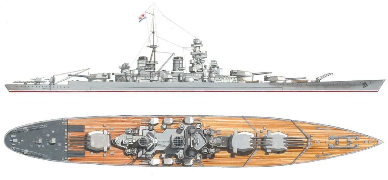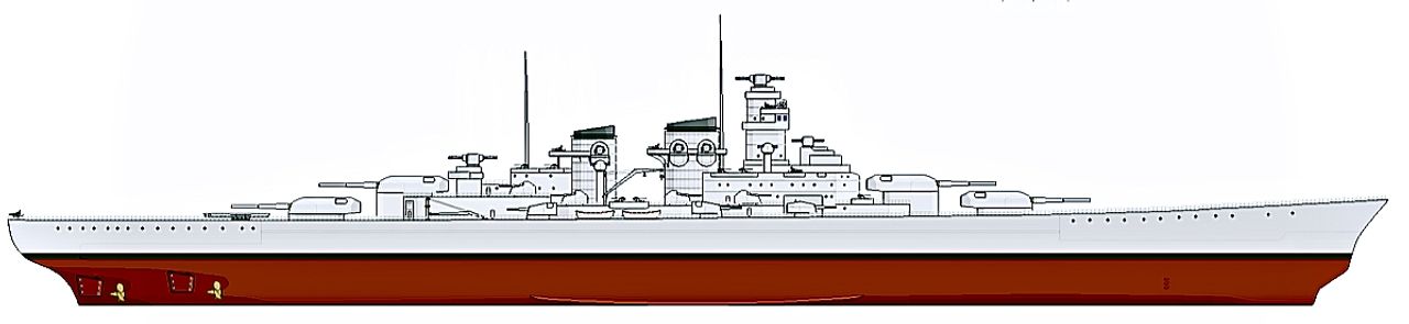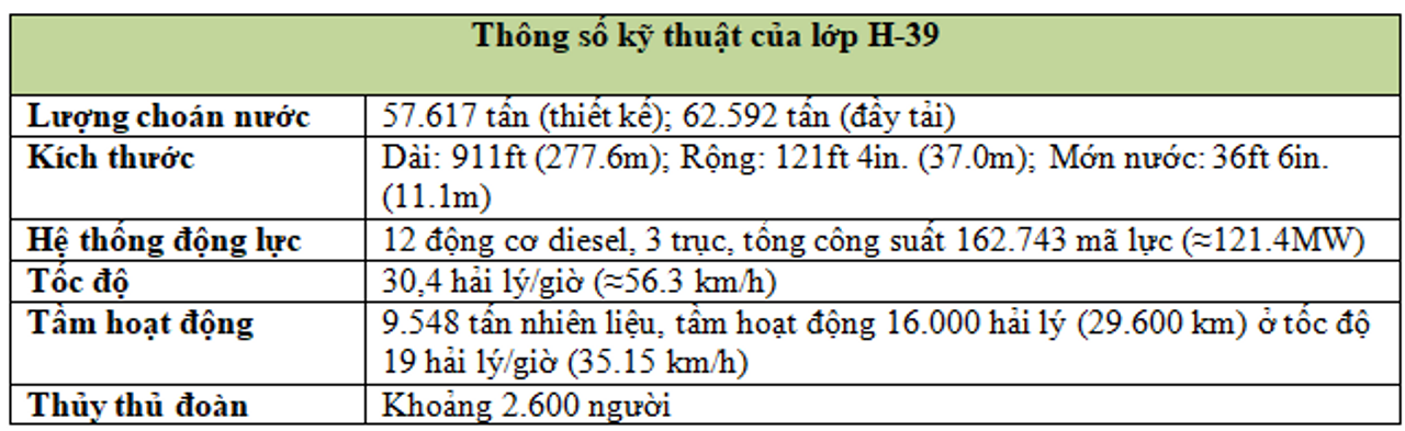 Những hình chiếu bên và từ trên xuống dưới đây mô tả một siêu thiết giáp hạm lớp H của Đức. Con tàu được mình hoạ dưới đây là theo thiết kế H-39, vốn có thể đã được đưa vào biên chế sớm nhất là năm 1944 nếu Hitler không khơi mào chiến tranh vào năm 1939. Các tàu lớp H-39 sẽ có nhiều điểm tương đồng với lớp Bismarck. Chúng sẽ mang một dáng vẻ cân đối và đầy uy lực, với hai tháp pháo 16in./50 phía trước và hai phía sau, cùng hai ống khói đồ sộ phục vụ cho 12 động cơ diesel. Hệ thống pháo hạng hai và phòng không cũng được thể hiện rõ ràng và rất giống với lớp Bismarck cả về số lượng lẫn cách bố trí. Cụ thể, bao gồm 12 khẩu pháo 5.9in./55 bố trí trong sáu tháp đôi trên boong chính, cùng với dàn pháo phòng không tầm xa gồm 16 khẩu 4.1in./65 đặt trong tám tháp pháo kín, bố trí cao hơn một cấp. Ngoài ra còn có hệ thống pháo phòng không hạng nhẹ, bao gồm 16 khẩu pháo 37mm/83 bố trí trong các tháp đôi. Ngoài hai ống khói khổng lồ, điểm khác biệt dễ nhận thấy nhất so với lớp Bismarck là việc di chuyển cơ sở hàng không từ vị trí giữa tàu ra một vị trí bất tiện ở phía sau. Chú ý đến bệ phóng máy bay đặt ngay bên dưới tháp pháo số 4 cỡ 16inch, còn lối vào nhà chứa máy bay nằm ngang hàng với tháp pháo số 3.