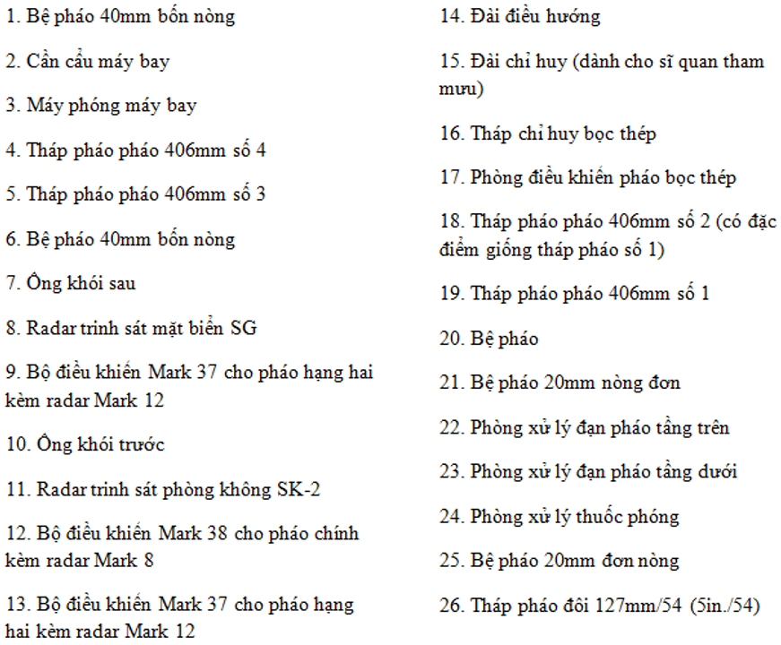 Dàn pháo chính gồm chín khẩu pháo 16 inch/50 bố trí trong ba tháp pháo ba nòng. Đây là loại pháo mới và đã vượt qua các thử nghiệm thành công vào năm 1940. Mỗi tháp pháo có kính ngắm 39 feet và có thể điều khiển tại chỗ. Hệ thống điều khiển hỏa lực trung tâm sử dụng hai kính ngắm lập thể dài 26 feet. Một kính để đo cự ly mục tiêu, còn kính kia đo điểm rơi của đạn pháo tàu bắn ra. Một máy tính cơ điện được lắp đặt để tính toán tầm bắn và góc bắn.