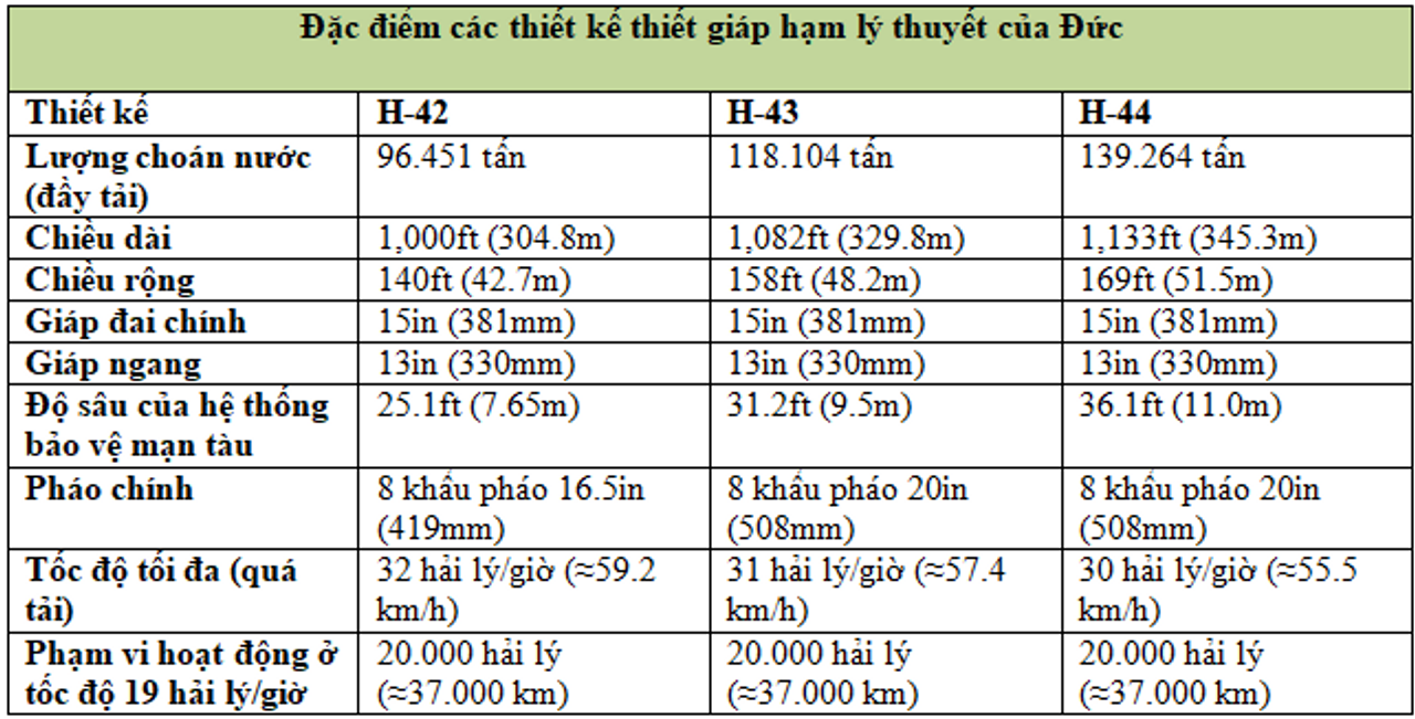 Các thiết kế cho thấy sự tiếp tục nhấn mạnh của Đức vào hỏa lực và phòng vệ. Tất cả đều lớn hơn đáng kể so với thiết kế H-41, cả về chiều dài lẫn bề ngang. Thiệt hại trong chiến tranh của Bismarck và Tirpitz đã được xem xét, dẫn đến những cải tiến đáng kể về mặt bảo vệ. Bề ngang cực lớn của các tàu này – lên đến 169 feet trong thiết kế H-44 – là kết quả của việc tăng độ sâu của hệ thống chống ngư lôi.