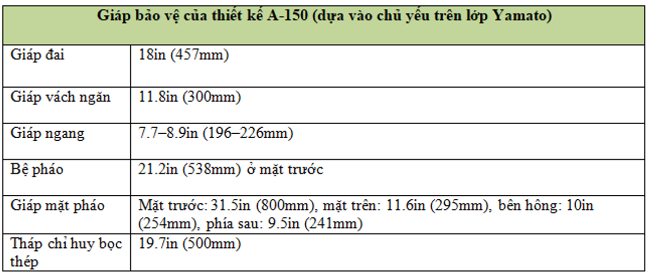Việc bảo vệ trên lớp Yamato mang lại một số manh mối về mức độ bảo vệ dự kiến cho Thiết kế A-150. Lớp Yamato là loại tàu chiến có giáp nặng nhất từng được chế tạo, với 33% (22.534 tấn) lượng choán nước thiết kế được dành riêng cho giáp. Điều này là cần thiết để đáp ứng yêu cầu thiết kế chịu được pháo 18 inch và có khả năng chống ngư lôi với đầu đạn TNT 660lb. Nếu Thiết kế A-150 bị giới hạn ở mức lượng choán nước như lớp Yamato, thì rất có thể mức giáp trang bị sẽ tương tự, có thể kèm theo một số cải tiến nhỏ. Ví dụ, trên lớp Yamato, mối nối giữa đai giáp trên và giáp dưới có thiết kế lỗi, sử dụng hai loại đinh tán khác nhau. Cách này thiếu độ bền ngang trước hiệu ứng cắt của một vụ nổ. Khi phần nối này thất bại, sự toàn vẹn của phòng giáp trung tâm bị ảnh hưởng nghiêm trọng. Người Nhật biết rõ lỗi này, nhưng vì muốn đảm bảo tiến độ đóng tàu, họ đã không sửa đổi thiết kế. Khả năng chống ngư lôi dưới nước của lớp Yamato cũng bị đánh giá thấp, điều đã được chứng minh trong chiến tranh khi cả Yamato, Musashi và chiếc thứ ba Shinano (được cải tạo thành tàu sân bay) đều bị đánh chìm bởi ngư lôi. Độ sâu tối đa (16,4 feet tại khu vực giữa tàu) của các gờ chống ngư lôi trang bị cho Yamato thấp hơn so với các thiết giáp hạm nước ngoài được thiết kế cùng thời. Ngoài ra, các gờ này không được bơm đầy chất lỏng nhằm hấp thụ lực nổ, điều khiến đai giáp bên trong dễ hứng chịu toàn bộ xung kích. Các khu vực không giáp như mũi và đuôi tàu chỉ dựa vào phân khoang. Tuy nhiên, các khoang ở những khu vực này quá lớn và hệ thống bơm không đủ mạnh, dẫn đến tình trạng ngập nước nghiêm trọng và con tàu bị nghiêng.