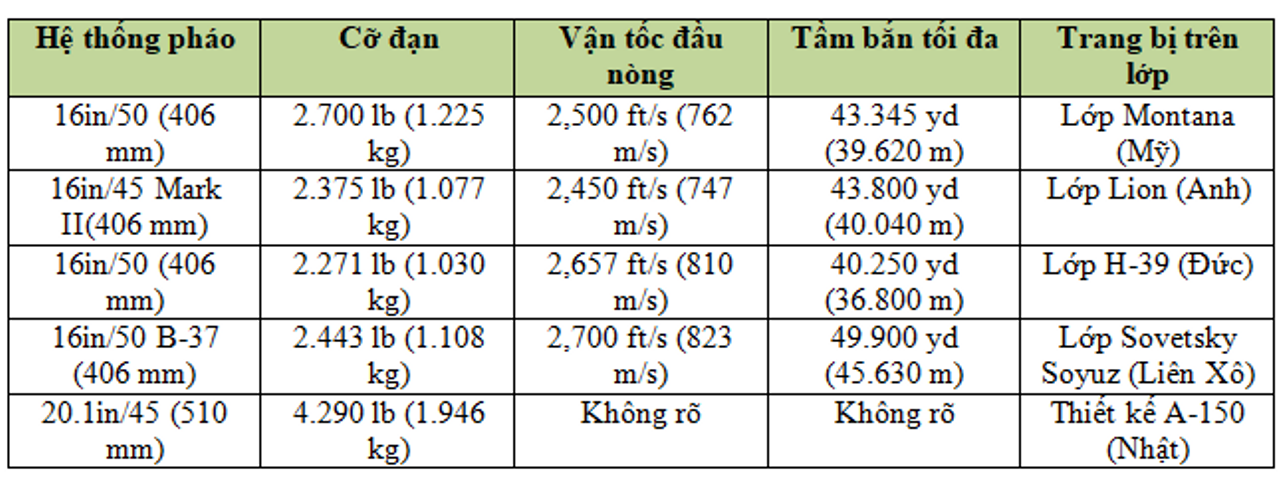 Các loại pháo được lên kế hoạch trang bị cho các siêu thiết giáp hạm trong cuốn sách này được trình bày trong bảng dưới. Tất cả đều là vũ khí mạnh với tốc độ bắn từ một đến hai phát mỗi phút. Loại đạn xuyên giáp có chụp đầu Mark 8 của Hải quân Hoa Kỳ nặng 2.700 lb, với vận tốc đầu nòng đạt 2.500 feet mỗi giây, có sức xuyên phá đáng nể. Ở cự ly 20.000 yard, đạn này có thể xuyên được 20 inch giáp thép thẳng đứng. Loại đạn này được trang bị cho lớp Iowa và cũng sẽ được trang bị cho lớp Montana nếu các tàu này hoàn tất. Để minh họa tầm quan trọng của trọng lượng đạn, có thể so sánh với khẩu pháo 16in/45 Mark II của Hải quân Hoàng gia Anh (RN), bắn loại đạn nặng 2.375 lb, chỉ có thể xuyên được 15,3 inch giáp thẳng đứng ở khoảng cách 20.000 yard và 3,2 inch giáp nằm ngang ở cùng cự ly.