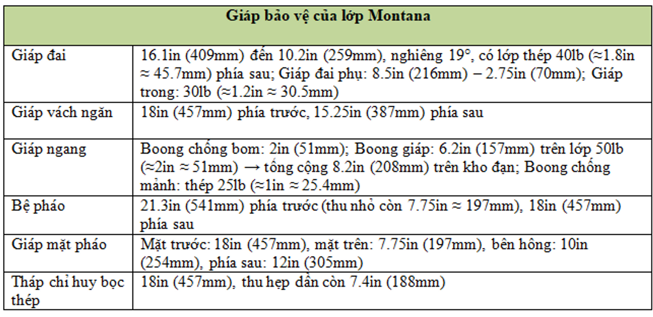 Theo đó, lớp Montana được trang bị giáp vành đai giáp chính dày 16,1 inch, đặt nghiêng 19 độ bên trong, tương đương với 21 inch giáp thẳng đứng. Bảo vệ theo phương ngang bao gồm ba lớp: boong chống bom (bomb deck), boong giáp chính (main armor deck), và boong chống mảnh (splinter deck). Tại các khu vực trọng yếu nhất (trên hầm đạn), tổng độ dày giáp có thể lên tới gần 10 inch.