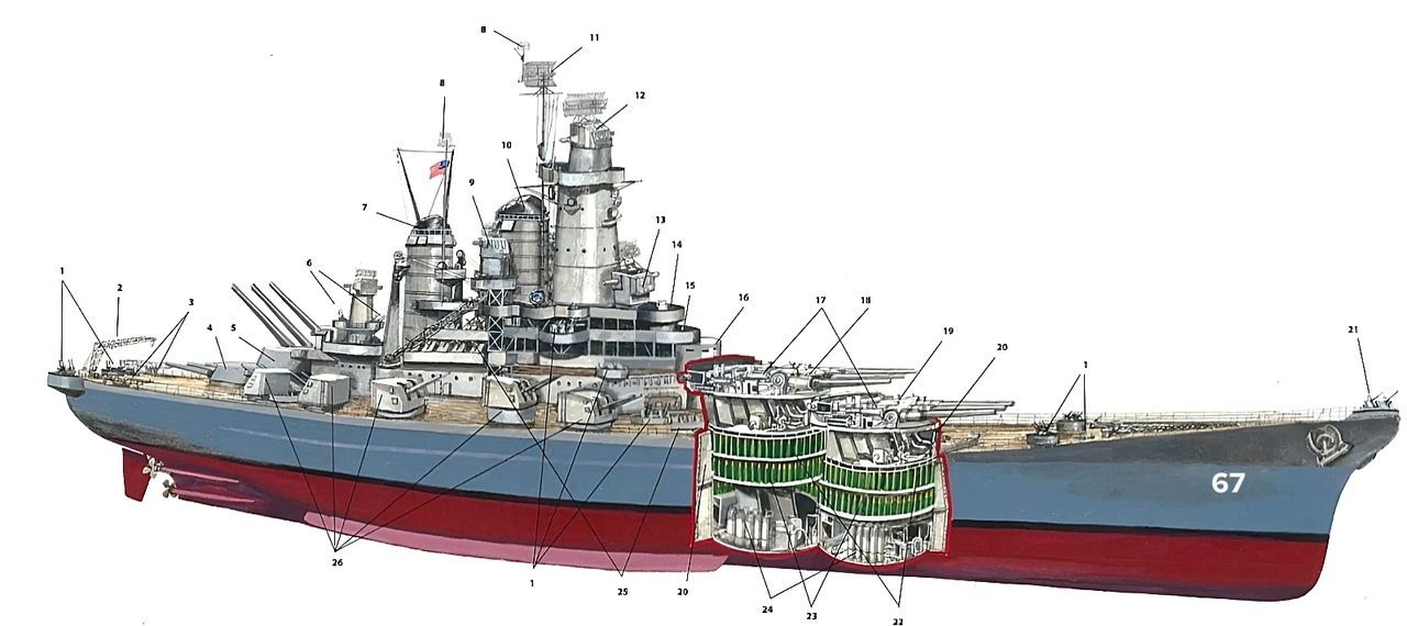 Iowa, được thể hiện trong bức ảnh chụp tháng 12 năm 1944, được thiết kế để đạt tốc độ cao, với thân tàu tương đối mỏng và hệ thống động lực mạnh mẽ. Tuy nhiên, con tàu vẫn được bảo vệ chắc chắn và mang một dàn pháo chính mạnh mẽ gồm ba tháp pháo ba nòng 16 inch/50 như trong hình. Tuy vậy, Hải quân Hoa Kỳ vẫn ưu tiên một thiết giáp hạm được trang bị và bảo vệ mạnh mẽ hơn – đây chính là cơ sở cho lớp Montana. (Naval History and Heritage Command)