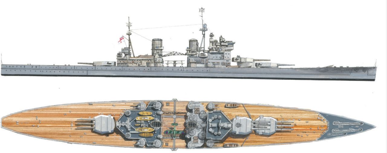 Tàu Howe, một trong các thiết giáp hạm lớp King George V của Hải quân Hoàng gia Anh, đang đi qua kênh đào Suez vào năm 1944 trên đường gia nhập Hạm đội Viễn Đông Anh. Với lớp ngụy trang thời chiến, hệ thống điện tử đầy đủ và các tổ hợp pháo phòng không, đây là hình ảnh gần như tương đồng với hình dáng mà một tàu lớp Lion sẽ có vào giai đoạn cuối chiến tranh, ngoại trừ việc các tháp pháo ba nòng 406mm sẽ thay thế dàn pháo chính 356mm của Howe. (Naval History and Heritage Command)