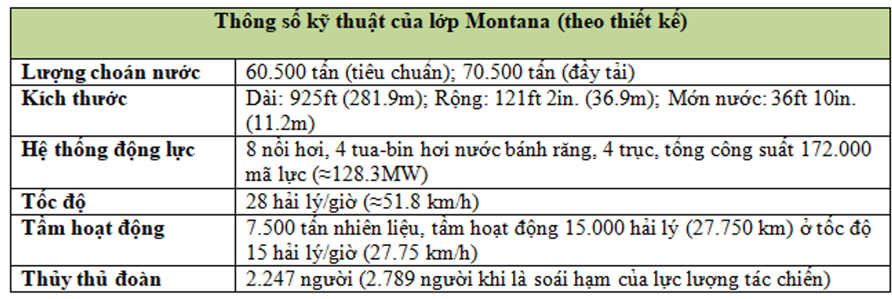 Hải quân Mỹ xem lớp Iowa là một thiết kế kém hơn so với lớp Montana. Với lượng rẽ nước lớn hơn đáng kể để khai thác, các kỹ sư Mỹ đã đưa ra lớp Montana cân bằng và mạnh mẽ hơn nhiều. Những tàu này sở hữu khả năng bảo vệ vượt trội – chỉ chúng mới có thể chịu được pháo 16 inch/50 và đầu đạn nặng 2.700 lb, được Hải quân Mỹ xem là khẩu pháo hải quân tốt nhất thế giới. Montana là tàu chiến được vũ trang mạnh nhất từng được thiết kế, với loạt bắn mạn tàu lớn hơn bất kỳ thiết giáp hạm nào khác. Ưu thế hỏa lực thực sự của lớp tàu này là hệ thống điều khiển hỏa lực vượt trội. Nhượng bộ duy nhất trong thiết kế mà các kỹ sư Mỹ thực hiện là ở tốc độ. Tổng thể mà nói, lớp Montana là lớp siêu thiết giáp hạm chưa hoàn thành tốt nhất.