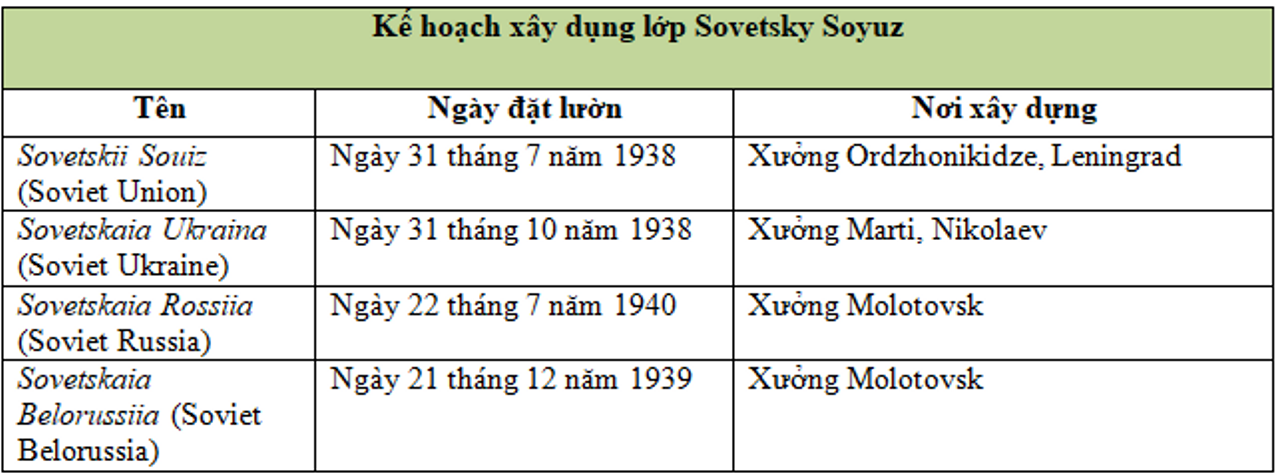 Bốn con tàu được đặt lườn và dự kiến hoàn thành vào năm 1939 và đưa vào phục vụ hạm đội vào năm 1941. Tuy nhiên, lịch trình này không bao giờ khả thi. Con tàu dẫn đầu, Sovetskii Soiuz, được cho là bắt đầu đặt ky vào tháng 7 năm 1938 để xoa dịu Stalin. Công việc thực sự chỉ bắt đầu vào tháng 1 năm 1939. Việc đóng hai tàu tại Leningrad và hai tàu tại Nikolaev như kế hoạch ban đầu là bất khả thi, vì vậy hai tàu được chuyển đến xưởng đóng tàu mới tại Molotovsk gần Arkhangelsk. Các bộ phận cho hai con tàu này được chế tạo tại Leningrad và sau đó được chuyển lên phía bắc đến cơ sở mới.