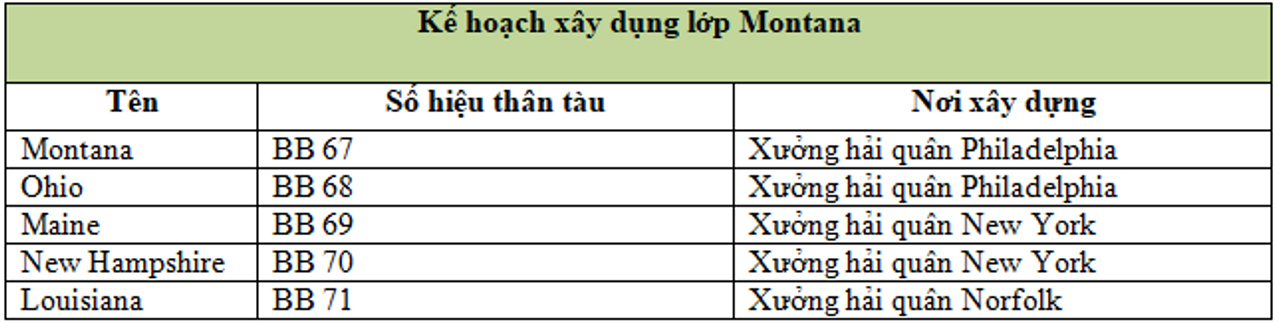 Montana sẽ là chiếc dẫn đầu trong tổng số năm tàu nếu việc đóng lớp này được hoàn tất. Với sự kết hợp giữa hỏa lực và tốc độ, Montana sẽ trở thành thiết giáp hạm mạnh nhất từng được Hải quân Hoa Kỳ đưa vào biên chế. Trong hình, con tàu được mô tả theo sơ đồ ngụy trang Measure 21 trong phiên bản sửa đổi năm 1945.