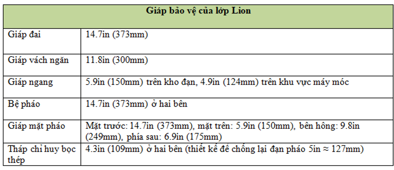 Lớp Lion được thiết kế với mức độ bảo vệ nặng nề nhất từng được lên kế hoạch cho một thiết giáp hạm của Hải quân Hoàng gia. Dải đai giáp chính (main belt) được thiết kế để chống lại hỏa lực pháo 16 inch, với vùng miễn nhiễm (immunity zone) đạt từ 19.000–30.625 yard tại khu vực hầm đạn (magazine) và 22.000–27.250 yard tại khu vực động cơ. Bề dày tối đa của dải giáp là 14,71 inch và cao 15 feet. Dải giáp chính bắt đầu thu hẹp 6 inch bên dưới mực nước. Phần giáp dưới (lower belt) kéo dài 8,25 feet bên dưới giáp chính và thu hẹp còn 5,2 inch. Hệ thống giáp kéo dài thêm 40 feet về phía trước và sau các vách ngăn bọc giáp, với tổng chiều dài là 510 feet.