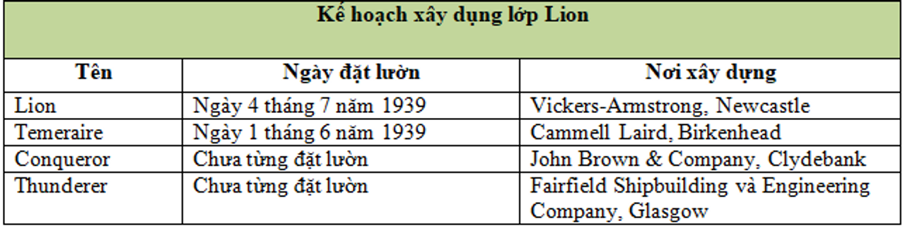 Các kỹ sư thiết kế của Anh đã phát triển kế hoạch cho một phiên bản cải tiến của lớp King George V, được gọi là lớp Lion. Đây sẽ là phản ứng của Hải quân Hoàng gia Anh (RN) trước chương trình siêu thiết giáp hạm của Đức. Bốn con tàu đã được lên kế hoạch; hai chiếc được đặt lườn trước chiến tranh, nhưng tất cả cuối cùng đều bị hủy bỏ và tháo dỡ.