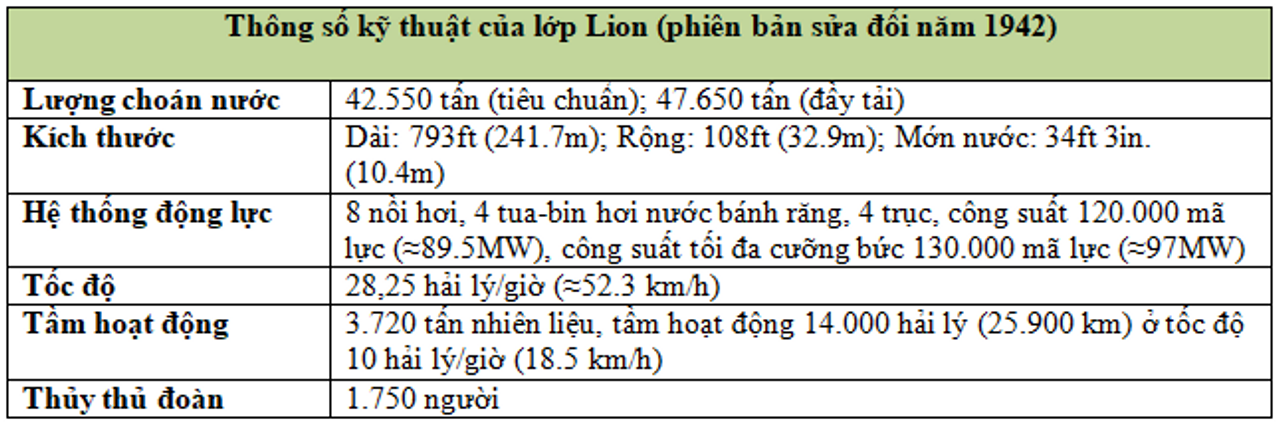 Xét đến các thiết kế của hải quân của hai cường quốc châu Âu, lớp Lion của Anh là một sự kết hợp tốt giữa hỏa lực, bảo vệ và tốc độ. Tuy nhiên, các đặc tính của con tàu không nổi bật ở bất kỳ khía cạnh nào. Như thiết kế ban đầu, lớp Lion có hai điểm yếu chính. Bản thiết kế lại năm 1942 đã giải quyết cả hai. Điểm yếu đầu tiên là hệ thống bảo vệ mạn tàu không đủ. Việc tăng chiều sâu trong thiết kế lại đã xử lý phần nào vấn đề này, nhưng người Anh vẫn giữ chiều ngang tối đa ở mức 108 feet để tàu có thể đi qua Kênh đào Panama, do đó không đạt được khả năng chống ngư lôi tối đa. Vấn đề thứ hai là tầm hoạt động hạn chế, đã được khắc phục bằng cách bổ sung 1.100 tấn nhiên liệu. Trong một cuộc đụng độ với đối thủ phe Trục, lớp Lion sẽ có lợi thế nhờ hệ thống radar điều khiển hỏa lực tuyệt vời.