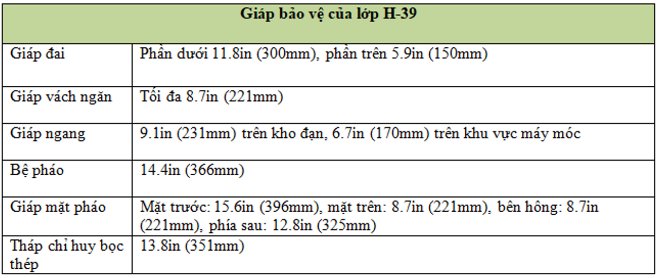 Khả năng bảo vệ của thiết kế H-39 khá khác biệt so với các thiết kế siêu thiết giáp hạm khác trong cuốn sách này. Đai giáp chính của tàu mỏng hơn so với các thiết kế nước ngoài và thiếu chiều sâu. Việc lắp thêm một đai giáp trên còn mỏng hơn đã làm tăng trọng lượng mà không mang lại khả năng chống lại pháo hạng nặng, thậm chí cả pháo 6 inch ở cự ly gần. Việc thiếu các thử nghiệm đầy đủ với bom cũng khiến khả năng bảo vệ ngang không đạt yêu cầu. Hai boong giáp sẽ không thể ngăn được các loại bom hạng nặng thả từ độ cao. Điều này xuất phát từ việc người Đức quyết định tăng cường giáp ở các khu vực khác để giữ trong giới hạn lượng rẽ nước. Ngay cả người Đức cũng nhận ra điều này là sai lầm và đã thêm boong giáp thứ ba trong các bản thiết kế sau. Khả năng bảo vệ dưới nước cũng yếu hơn so với các thiết kế nước ngoài, vì nó dựa trên hệ thống của tàu Bismarck, vốn đã cho thấy điểm yếu trước ngư lôi và đạn pháo xuyên nước cỡ 14 inch của Anh trong trận cuối cùng của Bismarck năm 1941. Thiết kế H-41 sau này, tập trung nhiều hơn vào bảo vệ, đã khắc phục phần nào những thiếu sót đó.