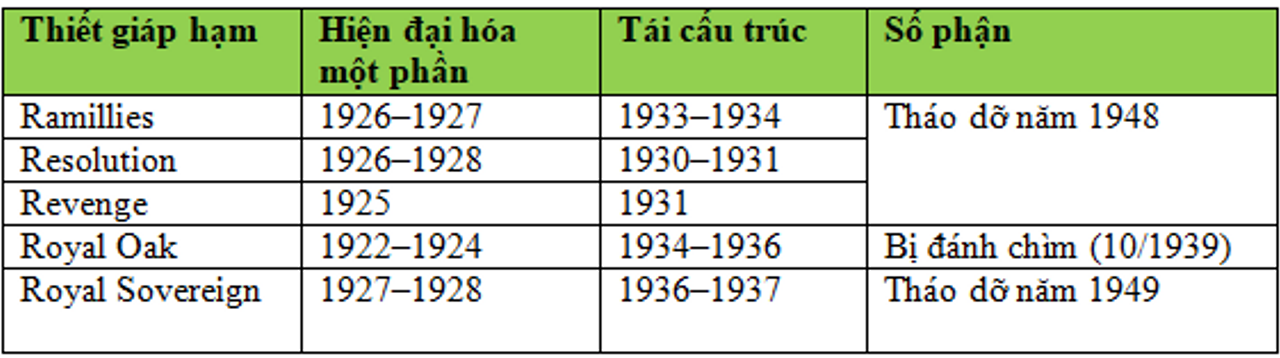 Điều tương tự áp dụng cho năm thiết giáp hạm lớp Royal Sovereign, tuy nhiên các cải biến ít sâu rộng hơn. Ngoại lệ là Royal Oak và Royal Sovereign, được nâng cấp ở mức tương đương với lớp Queen Elizabeth, dù không được trang bị máy bay.