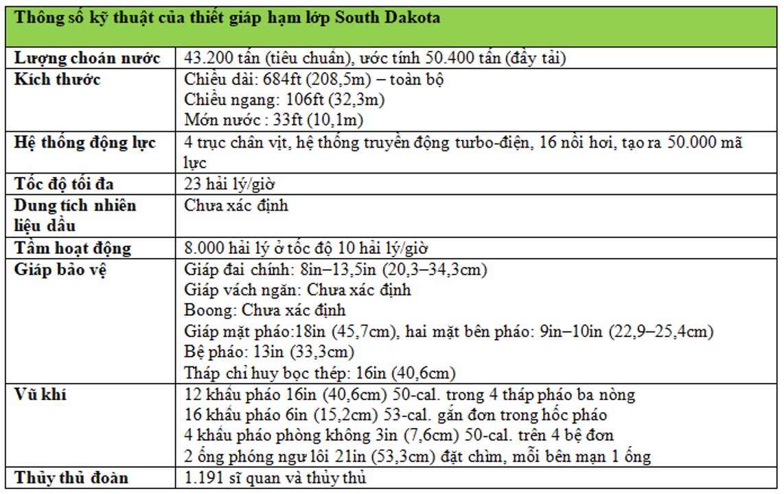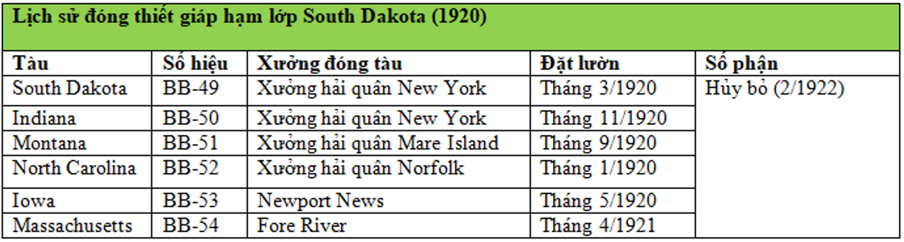 Cả sáu tàu đều được đặt lườn từ đầu năm 1920 đến đầu năm 1921. Tuy nhiên, tiến độ lại rất chậm do Hội nghị Washington đang diễn ra, tạo ra tâm lý e ngại về tương lai của các công trình đóng tàu. Sau khi Hiệp ước Washington được ký ngày 6 tháng 2 năm 1922, cả năm tàu đều bị hủy bỏ. Vì vậy, lớp South Dakota (năm 1920) trở thành lớp thiết giáp hạm cao tốc mà Hải quân Hoa Kỳ chưa bao giờ sở hữu trước đó. Các tàu lớp này sử dụng sơ đồ giáp "tất cả hoặc không có gì" tương tự các lớp tiêu chuẩn trước, nhưng được cải tiến với các vách ngăn chống đạn bổ sung và gia cố khu vực ống khói lớn. Chúng dài hơn 60 feet và nặng hơn khoảng 10.000 tấn so với lớp Colorado, nên cần hệ thống động lực mạnh hơn. Hệ thống truyền động turbine-điện được sử dụng, kết hợp với 12 nồi hơi tạo ra khoảng 50.000 mã lực, giúp tàu đạt tốc độ 23 hải lý/giờ.