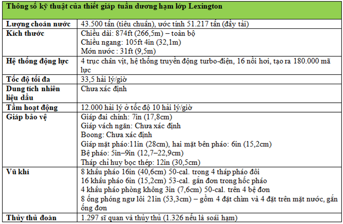 Kết quả là sự ra đời của lớp Lexington, gồm sáu thiết giáp tuần dương hạm dài, thon gọn, được trang bị tám khẩu pháo 16 inch/50 Mark III, chia thành bốn tháp pháo đôi. Nhìn chung, chúng giống những con tàu tuần dương được phóng to hơn là những thiết giáp hạm thực thụ, với giáp đai dày 7 inch và kiểu dáng giống Hood, con tàu từng gây ấn tượng mạnh với giới quan sát Mỹ. Tuy dài tới 874 feet như Hood, chúng lại dùng hệ truyền động turbine-điện cho tốc độ tối đa lên tới 33,5 hải lý/giờ. Bảy ống khói khiến chúng trông giống tàu tuần dương hơn là tàu chiến chủ lực. Tuy nhiên, nhược điểm lớn nhất là lớp giáp của nó quá mỏng, do vai trò thiết kế thiên về “trinh sát chiến đấu” (battle scout). Các kỹ sư lập luận rằng nếu khu vực tháp pháo, hầm đạn và trụ pháo được bảo vệ tốt, thì sẽ tránh được thảm họa như đã xảy ra với các thiết giáp tuần dương hạm Anh ở Jutland. Giáp được bố trí nghiêng để tăng hiệu quả bảo vệ.