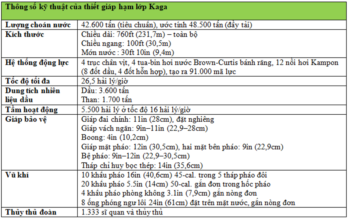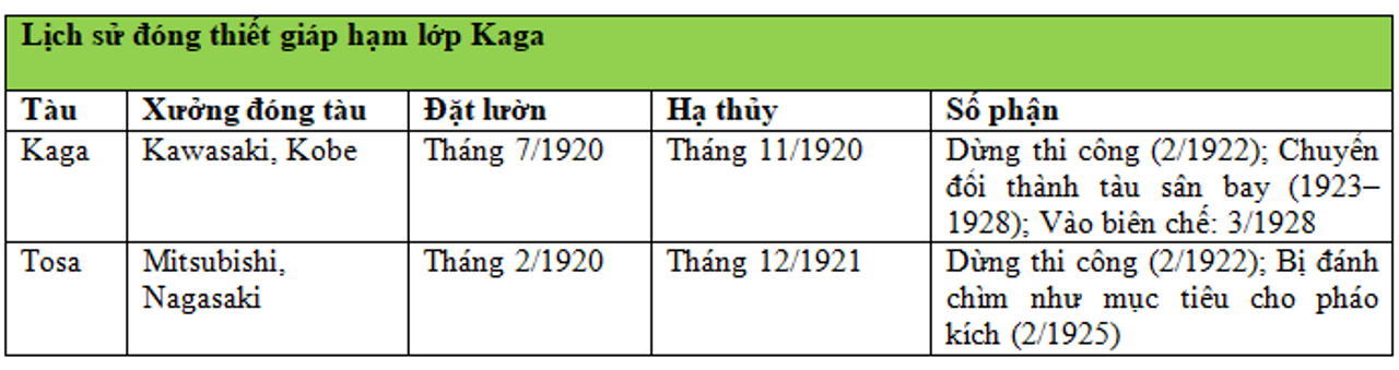 Nỗ lực của Nhật Bản trong việc xây dựng một hạm đội nhỏ nhưng cân bằng đã đặt gánh nặng lớn lên ngân sách quốc gia. Tuy nhiên, nước này vẫn có thể duy trì sản xuất đều đặn những thiết giáp hạm và thiết giáp tuần dương hạm được thiết kế tốt, qua đó thúc đẩy các kiến trúc sư hải quân ở các quốc gia khác phải cải tiến thiết kế của họ. Ví dụ, lớp thiết giáp tuần dương hạm Kongō được bảo vệ tốt hơn nhiều so với các đối thủ nước ngoài, trong khi các thiết giáp hạm lớp Fusō có tốc độ cao hơn các dreadnought trong biên chế của Mỹ hoặc Anh. Lớp thiết giáp hạm Kaga là bản cải tiến từ thiết kế Nagato trước đó, với bố trí giáp bảo vệ được cải thiện đáng kể – đó là kết quả của việc phân tích trận Jutland. Những chiếc này lẽ ra sẽ là những bổ sung hùng mạnh cho Hải quân Đế quốc, nhưng hai thiết giáp hạm của lớp lại không may được hạ thủy vào cuối năm 1921, ngay khi Hội nghị Hải quân Washington đang diễn ra. Kết quả là, công việc bị đình chỉ vào ngày 5 tháng 2 năm 1922.