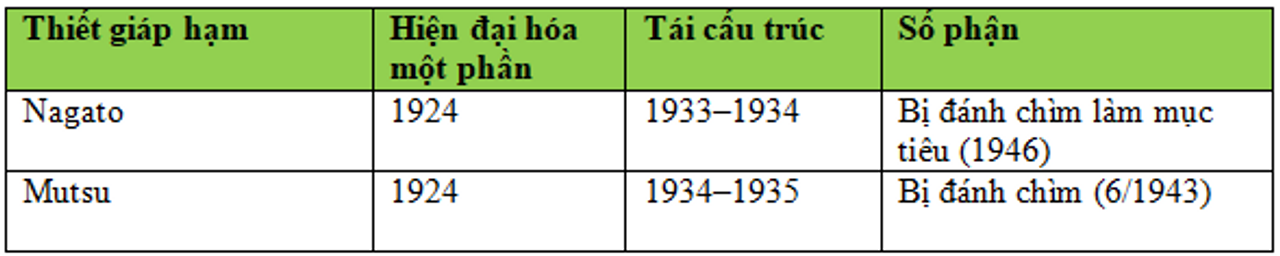 Lớp Nagato trải qua một cuộc đại tu vào đầu những năm 1930, trong đó các ụ chống ngư lôi được bổ sung, giáp boong lại được tăng cường, thân tàu được kéo dài và ống khói được gộp lại. Cả hai lớp thiết giáp hạm này đều được cải tạo sâu cấu trúc thượng tầng, áp dụng thiết kế “tháp chùa” (pagoda) mới được các nhà thiết kế hải quân Nhật Bản ưa chuộng. Trong mọi trường hợp, kinh nghiệm thu được trong những năm đầu chiến tranh đã dẫn đến việc bổ sung thêm pháo phòng không hạng nhẹ, và vào năm 1944, với những con tàu còn hoạt động, việc trang bị radar cũng được thực hiện.