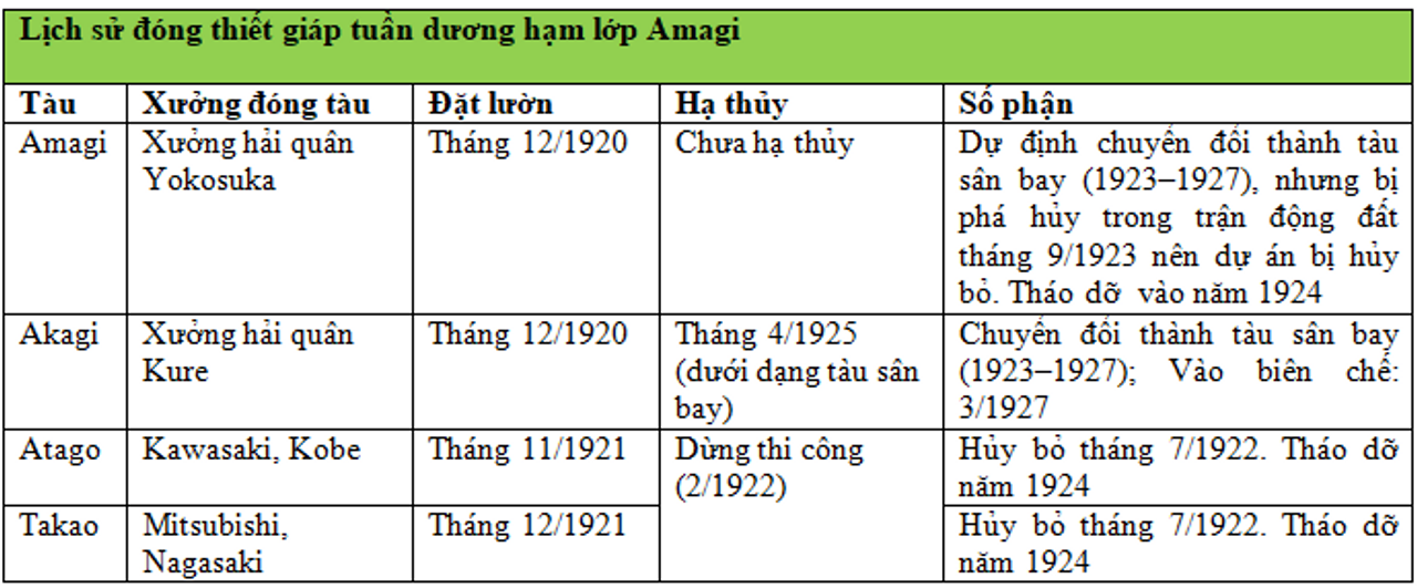 Lớp Amagi gồm bốn thiết giáp tuần dương hạm về cơ bản là phiên bản phóng lớn của lớp thiết giáp hạm Kaga, nhưng có giáp mỏng hơn và tốc độ cao hơn. Chúng được đặt lườn theo hai đợt, vào cuối năm 1920 và sau đó là cuối năm 1921. Với thời gian hoàn tất dự kiến là ba năm, tất cả vẫn còn trên ụ tàu khi Hội nghị Washington bắt đầu. Mọi công việc bị đình chỉ vào ngày 5 tháng 2 năm 1922, và trong khi hai chiếc sẽ bị tháo dỡ, các điều khoản của hiệp ước cho phép chuyển đổi hai chiếc còn lại thành tàu sân bay. Một cách tất yếu, do chúng có mức độ hoàn thiện cao nhất, Amagi và Akagi được chọn để chuyển đổi.