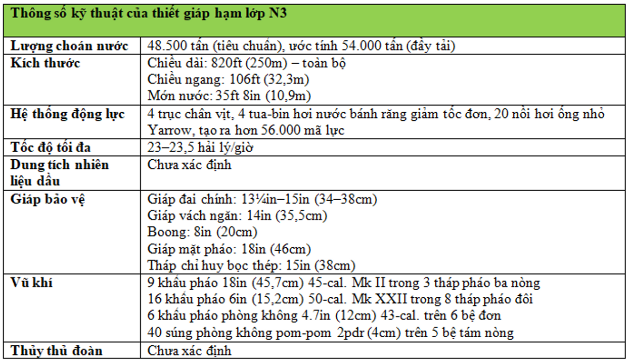 Bên cạnh lớp thiết giáp tuần dương hạm G3, Bộ Hải quân Anh cũng chỉ thị cho Giám đốc Cục Thiết kế Hải quân lập kế hoạch cho một lớp bốn thiết giáp hạm mới. Nhiều phương án đã được xem xét, với nhiều cách bố trí khác nhau của dàn pháo chính. Cuối cùng, họ lựa chọn một bố cục nhìn chung tương tự như các thiết giáp tuần dương hạm lớp G3, mà họ hy vọng sẽ bắt đầu đóng vào cuối năm 1921. Tuy nhiên, với lớp N3, tốc độ của tàu bị giảm xuống để phù hợp với tốc độ chậm hơn của lực lượng thiết giáp hạm hiện có — trong khoảng từ 21 đến 23 hải lý/giờ. Vỏ giáp của các thiết giáp hạm lớp N3 được tăng cường rõ rệt, mặc dù vẫn sử dụng cấu hình “bảo vệ tất cả hoặc không có gì” giống như lớp thiết giáp tuần dương hạm G3. Điều này có nghĩa là đai giáp dày nhất được tập trung quanh hầm đạn pháo chính, cùng với phòng máy và nồi hơi. Điều thực sự khiến các tàu này trở nên khác biệt là hệ thống hỏa lực mạnh mẽ của chúng — chín khẩu pháo 18 inch, bố trí trong ba tháp pháo ba nòng. Tuy nhiên, khi bản thiết kế N3 đang được vẽ, khẩu pháo 18 inch Mark II vẫn còn đang ở giai đoạn thử nghiệm, và thiết kế của nó gặp nhiều vấn đề. Vì vậy, mặc dù Bộ Hải quân đã chọn loại pháo khổng lồ này, nhưng các vấn đề như sóng chấn động gây hư hại cho tàu khi bắn, cũng như độ tin cậy của pháo, vẫn chưa được khắc phục. Cuối cùng, cả lớp tàu này lẫn các loại pháo của chúng đều bị từ bỏ sau Hiệp ước Washington.