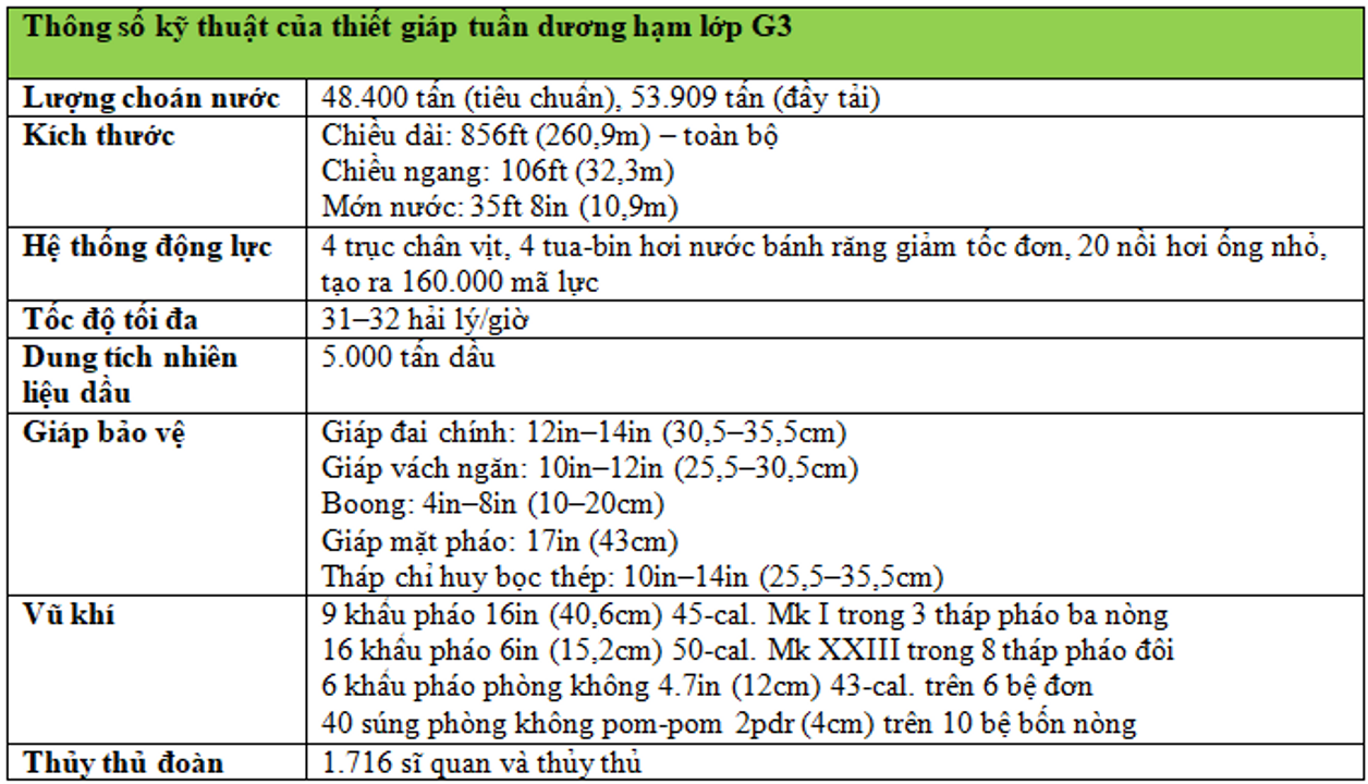 Thiết kế đầu tiên, mã hiệu “G3”, là một phiên bản cải tiến của các thiết giáp hạm cao tốc hiện có trong hạm đội, mặc dù được phân loại là thiết giáp tuần dương hạm do tốc độ cao và hỏa lực nhẹ hơn so với thiết kế thứ hai, “N3”, vốn là một “siêu thiết giáp hạm” – nâng cấp từ các siêu dreadnought hiện có. Thiết giáp tuần dương hạm G3 sẽ có lượng giãn nước trên 48.000 tấn, nhiều hơn khoảng 20.000 tấn so với các thiết giáp hạm cao tốc hiện có được trang bị pháo 15 inch trong hạm đội. Chúng sẽ được bảo vệ bởi đai giáp dày tới 14 inch – đủ sức chống lại pháo 18 inch ở khoảng cách trên 8 hải lý. Hệ thống động lực turbine hơi nước sẽ cho phép những con tàu này đạt tốc độ vượt quá 30 hải lý/giờ, trong khi hỏa lực – gồm chín pháo 16 inch Mark I đặt trong ba tháp pháo ba nòng – sẽ khiến chúng trở thành những tàu chủ lực mạnh nhất trong hạm đội.