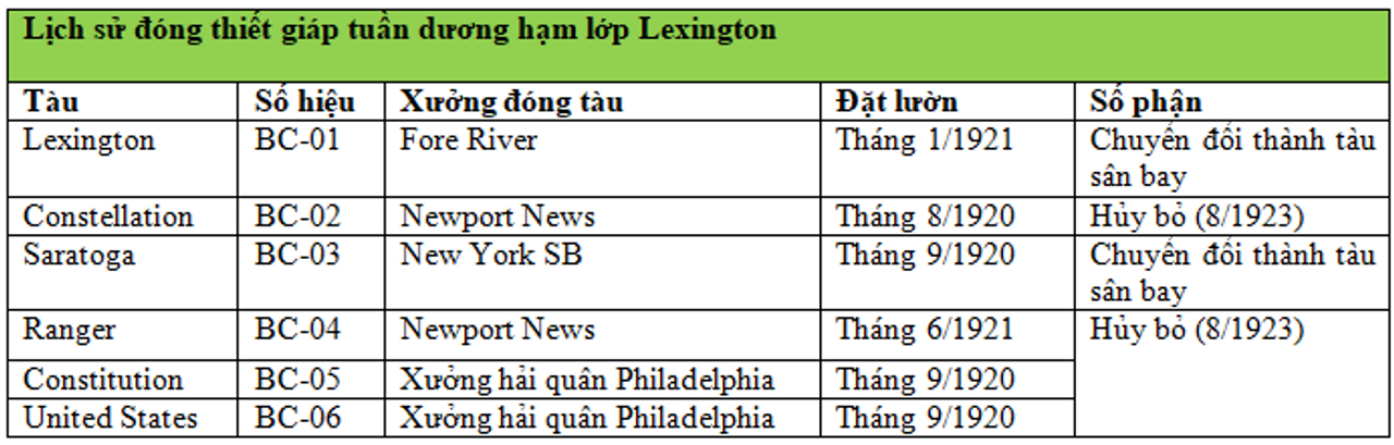 Chiếc đầu tiên của lớp Lexington được đặt lườn vào cuối hè năm 1920 và đến mùa hè năm sau, cả sáu chiếc đều đang được xây dựng. Giống như lớp South Dakota, tiến độ rất chậm do Hội nghị Washington và vì ngày càng có quan điểm cho rằng các thiết giáp tuần dương hạm đã lỗi thời. Thậm chí đã có kế hoạch chuyển đổi chúng thành tàu sân bay. Sau khi Hiệp ước Washington được ký vào tháng 2 năm 1922, việc xây dựng bị tạm ngừng, nhưng quyết định loại bỏ chúng bị hoãn lại để xem xét các phương án thay thế. Cuối cùng, Constellation, Ranger, Constitution và United States bị hủy bỏ vào tháng 8 năm 1923. Hai tàu có tiến độ thi công cao nhất là Lexington và Saratoga được giữ lại và chuyển đổi thành tàu sân bay.