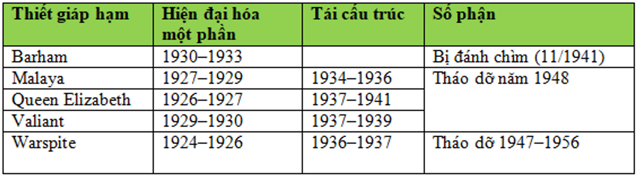 Trong khi phần lớn hạm đội dreadnought của Anh bị tháo dỡ sau Hiệp ước Washington, Bộ Hải quân quyết định giữ lại các thiết giáp hạm trang bị pháo 15 inch thuộc lớp Queen Elizabeth và Royal Sovereign. Trong số năm chiếc thuộc lớp trước được đưa vào biên chế từ 1915–1916, tất cả đều được cải tạo trong thời kỳ giữa hai cuộc chiến. Việc đại tu một phần thường bao gồm thêm bầu chống ngư lôi, gom các ống khói thành một cụm và bổ sung pháo phòng không cỡ trung (4 inch). Việc đại tu toàn diện bao gồm việc dỡ bỏ và tái cấu trúc nội thất, bổ sung hệ thống động lực mới, gia cố giáp sàn, lắp cột buồm kiểu giá ba chân, hệ thống ngắm bắn mới, nhà chứa và máy phóng máy bay, cùng với việc lắp đặt hệ thống điều khiển hỏa lực tầm cao (HACS) để điều phối hỏa lực phòng không của các tháp pháo 4 inch mới và pháo pom-pom 2 pdr. HMS Barham chưa bao giờ được đại tu toàn diện.