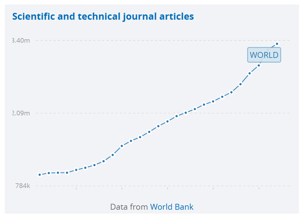 Bước sang thế kỷ 21, thế giới chứng kiến nhiều thay đổi lớn. Khối lượng tri thức nhân loại bùng nổ theo cấp số nhân: mỗi phát hiện mới gần như ngay lập tức trở thành nền tảng cho hàng loạt hướng nghiên cứu tiếp theo, tạo thành một dây chuyền khám phá không ngừng tăng tốc. Nếu Edison mất hàng chục năm để cải tiến bóng đèn, thì chỉ vài thập kỷ sau, transistor đã mở đường cho máy tính, rồi internet, và hiện nay là trí tuệ nhân tạo mà chúng ta sử dụng hằng ngày. Theo số liệu từ World Bank, số lượng bài báo khoa học và kỹ thuật trên thế giới đã tăng gấp ba lần từ năm 2000 đến 2022 [1]. Mặc dù số lượng bài báo không phải là thước đo hoàn hảo phản ánh đầy đủ mọi nghiên cứu hay tri thức đang tồn tại thì biểu đồ này vẫn là một minh họa rõ ràng cho tốc độ tăng trưởng vượt bậc của sự phát triển khoa học.