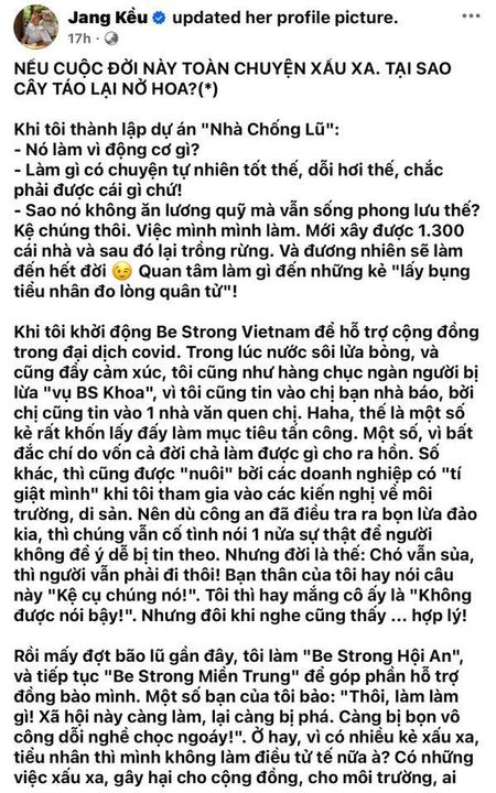 Chị Jang Kều là 1 nick rất nổi tiếng vì tạo ra các quỹ Sống foundation, Nhà chống lũ... Tức là chị ấy là người đại diện pháp luật cho các tổ chức NGO của Việt Nam. Tối qua (7/8) chị ấy post bài về bác sĩ Khoa. Ít lâu sau post tiếp "đã nói chuyện với bác sĩ Khoa, và mai quỹ Be Strong sẽ chuyển máy thở cho bệnh viện..." Sáng nay, anh Hiển Mực post tus xin lỗi vì anh dựng lên hình tượng bác sĩ Khoa. Mọi người xúm vào ch.ử.i anh ta, dọa kiện cáo lọ chai. Nhưng JK khi bị hỏi "vậy hôm qua chị nói chuyện với bs Khoa là ai" thì bắt đầu quanh co. Sau đó post comment là bs Khoa ở bệnh viện Hạnh Phúc. Lúc thì bs Khoa ở bệnh viện Chợ Rẫy. Lúc thì bs Khoa nhờ bs Thanh nhận máy, lúc lại bs Huy. Mỗi lần post là 1 status/comment nhảm nhí. Sau thấy tình hình căng quá, chị xóa bài cái rẹt. Tiếp nữa post 1 bài kể lể là do lấy tin từ status của nhà báo Phương Nam, rồi vì cảm tính mà tin tưởng bài post. Kèm theo đó là công văn gửi bv Chợ Rẫy, và hình ảnh đoạn chat với bác sĩ Khoa. Chưa đầy 2 phút sau, nhà báo Phương Nam vào comment "mình copy từ status của Jang, sao lại bảo mình lên status". Chị JK lại sửa status là "1 nhà báo quen" và xóa comment của nhà báo PN đi. Rất hay là nhiều người chụp được màn hình, post tiếp lên hỏi thì lờ đi ko trả lời. Mọi người tiếp tục hỏi tại sao không chụp full màn hình chat với bs Khoa, mà cắt ghép tùm lum không có giờ chat (nghi vấn là dựng) nhưng chị Jang không trả lời. Đến bây giờ lại post bài xin lỗi là chưa kiểm chứng thông tin mà đã post bài về bác sĩ Khoa. Nhưng nhiều người vào hỏi "vậy status hôm qua chị lên và nói là đã nói chuyện với bs Khoa là nói chuyện với ai?" (vì rõ ràng bs Khoa là 1 nhân vật hư cấu). Một số người bắt đầu comment là họ đã chuyển tiền cho quỹ tối qua, có bạn chuyển 100 triệu ngay trong đêm vì bài post bs Khoa kia. Một số thì comment là trước đây chuyển tiền nhưng không có xác nhận từ quỹ đã nhận được tiền. Chị JK là người rất nổi tiếng vì làm nhà chống lũ, trồng cây, lên tiếng vì dự án đồi cỏ hồng Đăk Đoa, lên tiếng về việc Vin group định lấn vịnh xây chung cư... và chị JK học cùng khóa với chị Phạm Đoan Trang. ---Cre: Huong Nguyen---
