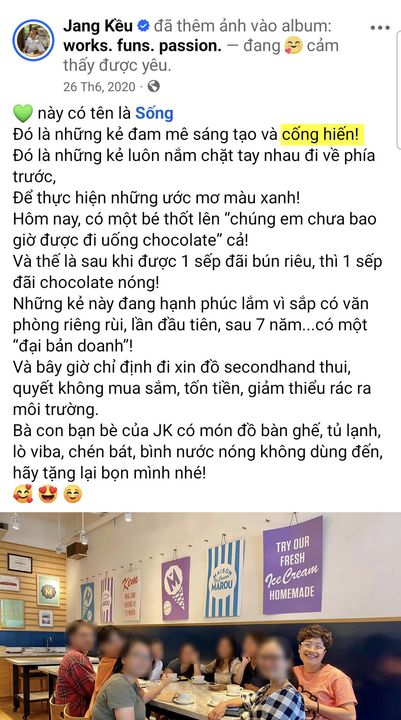 Hehe, cụ thể là liên hệ với cán bộ tên gì, giữ vị trí nào ở địa phương hả bạn? Nhớ hồi năm 2019, khi Quỹ Sống đăng thông tin rầm rộ trên mxh kêu gọi gây quỹ trồng rừng tại Cù Lao Dung, chính tôi gọi điện trực tiếp đến Thường vụ huyện Đoàn Cù Lao Dung để hỏi về dự án Hạnh Phúc Xanh thì bạn nam ấy bó tay luôn, chưa từng nghe ai nói gì đến Quỹ Sống, Hạnh Phúc Xanh hay trồng rừng, trồng bần gì hết! Bởi vậy, nhiều khi chúng ta đi ăn tân gia trong xóm, biết đâu ngôi NHÀ LẦU "tình thương" mới xây khang trang, đẹp đẽ ấy lại chính là nhà do Quỹ Sống xây!