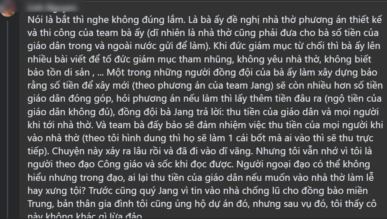 Tôi có biết vụ chị Jang từng bất đồng với một cha xứ trong vụ xây nhà thờ, thương vụ ấy thất bại, chị Jang cay, lên bài tố cha xứ nọ kia... Tuy nhiên, tôi không theo đạo nên không theo dõi kỹ thương vụ thiện nguyện này, xin phép không phân tích sâu thêm, chỉ dẫn lời kể của một bạn theo đạo: