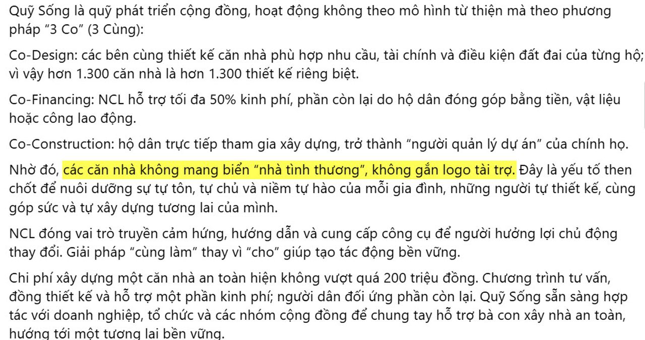 – Lý do 1: tạo ra sự nhập nhằng khiến người ta rất khó check var Quỹ Sống đã xây được bao nhiêu nhà chống lũ vì không phân biệt nổi đâu là nhà chống lũ do dân tự xây và đâu là nhà chống lũ được Quỹ Sống hỗ trợ.