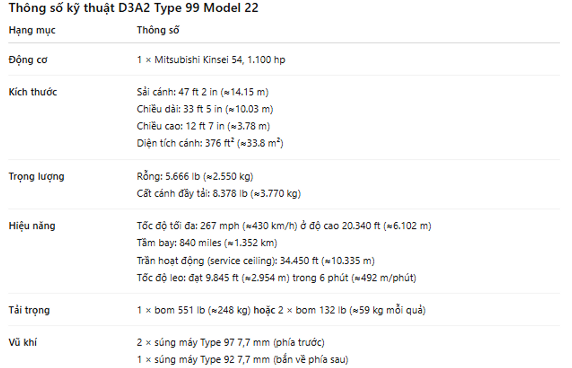 Máy bay này trông lỗi thời với bộ càng đáp cố định, và tốc độ chậm khiến “Val” khó hoạt động trong vùng không phận bị tranh chấp. Vào tháng 6 năm 1942, một phiên bản cải tiến với động cơ mạnh hơn bắt đầu bay thử nghiệm. D3A2 Type 99 Model 22 bắt đầu thay thế D3A1 từ cuối năm 1942. Tuy nhiên, biến thể mới chỉ tăng tốc độ đôi chút và điều này không làm giảm được mức độ dễ tổn thương ngày càng tăng của “Val.” Khi máy bay ném bom tàu sân bay D4Y (“Judy”) được ra mắt vào năm 1943, “Val” bị giáng xuống làm nhiệm vụ phụ. Từ mùa thu năm 1944, các “Val” bố trí trên đất liền ngày càng được sử dụng như máy bay kamikaze, và đến năm 1945, những chiếc vốn được dùng cho huấn luyện cũng được đưa trở lại chiến tuyến như máy bay cảm tử.