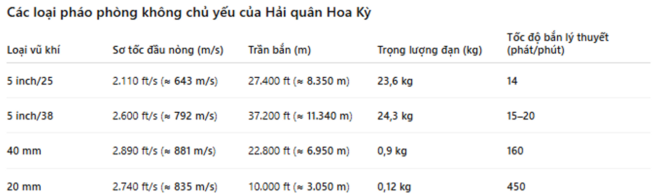 Hầu hết các tàu lớn của Hải quân Mỹ đều mang ba loại pháo phòng không. Vũ khí tầm xa nhất là pháo cỡ nòng trung bình, tiêu biểu trong Hải quân Mỹ là pháo 5in./38 đa dụng. Vũ khí tầm trung như pháo 40mm tạo thành lớp phòng thủ tiếp theo. Cuối cùng, mỗi tàu đều mang một số lượng lớn vũ khí tầm ngắn, gần như luôn là pháo 20mm, để phòng thủ ở cự ly gần.