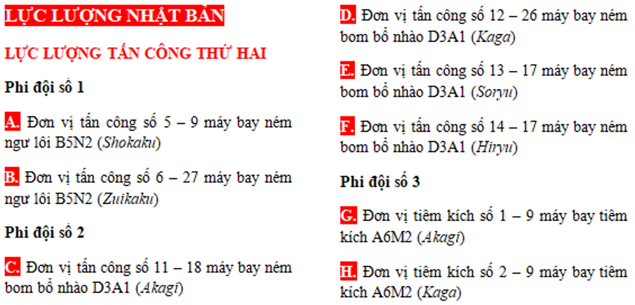 Hình vẽ trên cùng là một chiếc Zero thuộc tàu sân bay Shokaku (ký hiệu EI); hình thứ hai là chiếc Zero do Thiếu tá Itaya Shigeru thuộc tàu sân bay Akagi (ký hiệu AII) điều khiển, người chỉ huy toàn bộ lực lượng tiêm kích của đợt tấn công thứ nhất. Hình dưới cùng là một chiếc Type 99 thuộc tàu sân bay Zuikaku (ký hiệu EII). Hình vẽ trên cùng ở đoạn tiếp theo mô tả một chiếc Type 99 thuộc tàu sân bay Kaga (ký hiệu AII). Chiếc máy bay ở giữa thuộc tàu sân bay Soryu (ký hiệu BI) và mang quả bom xuyên giáp đặc biệt nặng 1.764 pound, được sử dụng để tấn công khu vực dãy thiết giáp hạm. Chiếc máy bay ở dưới cùng thuộc tàu sân bay Hiryu (ký hiệu BII) và mang một quả ngư lôi Type 91.