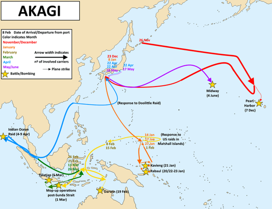 1. Akagi: Là soái hạm của Kido Butai, Akagi dẫn đầu lực lượng tàu sân bay trong cuộc tấn công Trân Châu Cảng vào ngày 7 tháng 12 năm 1941. Con tàu trở về Nhật vào ngày 23 tháng 12. Từ tháng 1 năm 1942, Akagi đã hỗ trợ cuộc xâm lược Rabaul tại quần đảo Bismarck. Akagi đã điều 20 máy bay B5N và 9 máy bay Zero cho cuộc tấn công đầu tiên vào Rabaul vào ngày 20 tháng 1, và tiếp tục tấn công Kavieng vào ngày hôm sau, với 9 máy bay A6M Zero và 18 máy bay D3A "Val". Hai ngày sau, Akagi cũng đã quay trở lại Rabaul đã chiếm trước đó. Sau đó, Akagi lên đường đến Truk vào ngày 27 tháng 1. Vào ngày 1 tháng 2, Akagi, Kaga và Zuikaku đã xuất kích để định vị và tấn công lực lượng Hoa Kỳ đang tập kích quần đảo Marshall, nhưng sau đó lại rút lui. Ngày 7 tháng 2, Akagi lên đường đến Biển Timor. Ngày 19 tháng 2, Akagi chỉ huy lực lượng tàu sân bay tham gia cuộc tấn công nổi tiếng vào Darwin ở Australia. Ngày hôm đó, Akagi đã cho xuất kích 18 máy bay B5N, 18 máy bay D3A và 9 máy bay Zero. Vào ngày 1 tháng 3, tàu chở dầu Pecos và sau đó là tàu khu trục USS Edsall của Mỹ đã bị phát hiện và đánh chìm bởi máy bay D3A từ Akagi (cùng với máy bay từ Sōryū). Vào ngày 5 tháng 3 năm 1942, Akagi đã hỗ trợ cuộc xâm lược Java, cung cấp 18 máy bay B5N và 9 máy bay Zero để không kích Tjilatjap. Họ đã đánh chìm 8 tàu trong cảng mà không bị tổn thất nào. Lực lượng Kido Butai sau đó khởi hành đến vịnh Staring, đảo Celebes để tiếp nhiên liệu và tiếp tế trong khi thủy thủ đoàn nghỉ ngơi. Akagi rời đảo Celebes để dẫn đầu Hải đội Tàu sân bay số 1 tấn công Colombo (Ceylon) vào ngày 26 tháng 3 năm 1942, cùng với phần còn lại của Kido Butai với mục đích là để làm suy yếu Hạm đội Viễn Đông của Anh. Vào ngày 5 tháng 4 năm 1942, 17 chiếc D3A cất cánh từ Akagi tham gia đánh chìm các tàu tuần dương hạng nặng HMS Cornwall và Dorsetshire, trước đó đã bị máy bay quan sát phát hiện. Điều này phần lớn được bù đắp cho kết quả ít ỏi ở Colombo. Vào ngày 9 tháng 4, Akagi đã tung ra tất cả 17 chiếc D3A có sẵn của mình cùng với nhiều chiếc khác từ Kaga và các tàu sân bay khác để đánh chìm cả hai tàu HMS Hermes và HMS Vampire. Tuy nhiên, cùng ngày hôm đó, Không quân Hoàng gia Anh (RAF) đã cho phóng 11 máy bay ném bom Bristol Blenheim của Anh, cất cánh từ Ceylon, xuyên thủng lớp phòng thủ yếu ớt của Akagi và thả bom xuống tàu sân bay từ độ cao 3.400 m (11.000 feet). Vào ngày 19 tháng 4 năm 1942, Akagi được gửi đến Đài Loan trong quá trình chuyển đến Nhật Bản cùng với Sōryū và Hiryū để truy đuổi USS Hornet và Enterprise sau cuộc không kích Doolittle. Nhưng sau đó, các tàu sân bay này đã quay trở lại Hawaii và Akagi từ bỏ cuộc truy đuổi để di chuyển đến Hashirajima vào ngày 22 tháng 4. Akagi neo đậu tại đây để tiến hành bảo dưỡng và sửa chữa để chuẩn bị cho chiến dịch cuối cùng tại Midway vào tháng 6 năm 1942.