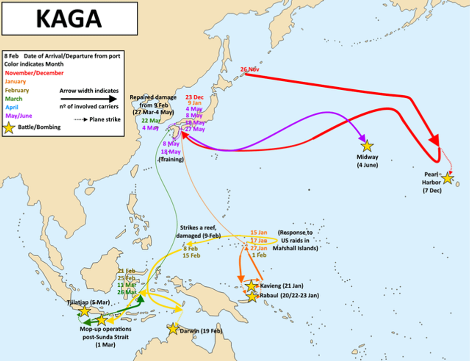 2. Kaga: tham gia trận Trân Châu Cảng cùng Akagi và trở về Nhật vào ngày 23 tháng 12 năm 1941. Vào tháng 1 năm 1942, Kaga trở lại hoạt động cùng với Akagi và các tàu sân bay thuộc Hải đội Tàu sân bay số 5. Chúng được gửi đến Truk ở Micronesia để hỗ trợ cuộc xâm lược Rabaul (quần đảo Bismarck). Kaga đã phóng 27 chiếc B5N mang bom được hộ tống bởi 9 chiếc Zero trên bầu trời Rabaul vào ngày 20 tháng 1 năm 1942, với một chiếc B5N bị hỏa lực phòng không tiêu diệt. Các vị trí của quân Đồng minh bị tấn công vào ngày hôm sau bởi 16 chiếc D3A. Vào ngày hôm sau, hai máy bay ném bom bổ nhào đã phải hạ cánh khẩn cấp. Kaga trở lại Truk vào ngày 25 tháng 1. Rabaul và Kiaveng thất thủ ngay sau đó. Vào ngày 9 tháng 2 năm 1942, Kaga đã đâm phải một rạn san hô ở Palau khi đang trên đường đánh chặn lực lượng tàu sân bay của Hải quân Hoa Kỳ tại quần đảo Marshall. Thiệt hại đã khiến tốc độ của con tàu bị giảm tốc độ xuống còn 18 hải lý/giờ nhưng nó đã được sửa chữa tạm thời và tiếp tục gia nhập Kido Butai ở Biển Timor vào ngày 19 tháng 2. Con tàu cũng tham gia cuộc tấn công vào Darwin với 27 chiếc B5N, 18 chiếc D3A và 9 chiếc Zero. Thiệt hại của Kaga là mất một chiếc B5N. Vào tháng 3 năm 1942, Kaga hiện đang đóng quân tại Staring-baai để hỗ trợ cho cuộc xâm lược Java. Vào ngày 5 tháng 3 năm 1942 trong cuộc tấn công vào Tjilatjap, con tàu đã gửi 27 chiếc B5N dưới sự hộ tống của máy bay tiêm kích tham gia đánh chìm tám tàu của Đồng Minh và phá hủy một nhà kho lớn mà không có tổn thất nào. Kaga không tham gia cuộc đột kích Ấn Độ Dương vào tháng 4 năm 1942. Do hư hại nên con tàu được gửi đến Sasebo vào ngày 15 tháng 3 để sửa chữa, bắt đầu trong ụ tàu vào ngày 27 tháng 3 và kết thúc vào ngày 4 tháng 5. Con tàu cũng tham gia vào chiến dịch cuối cùng tại Midway.