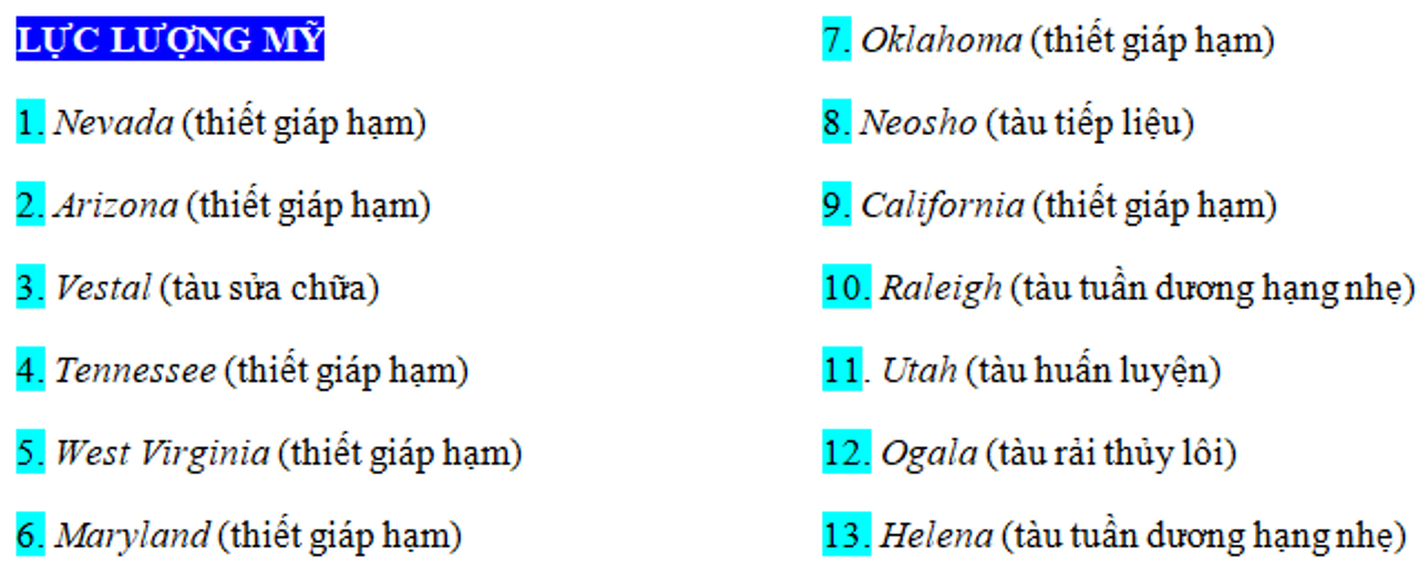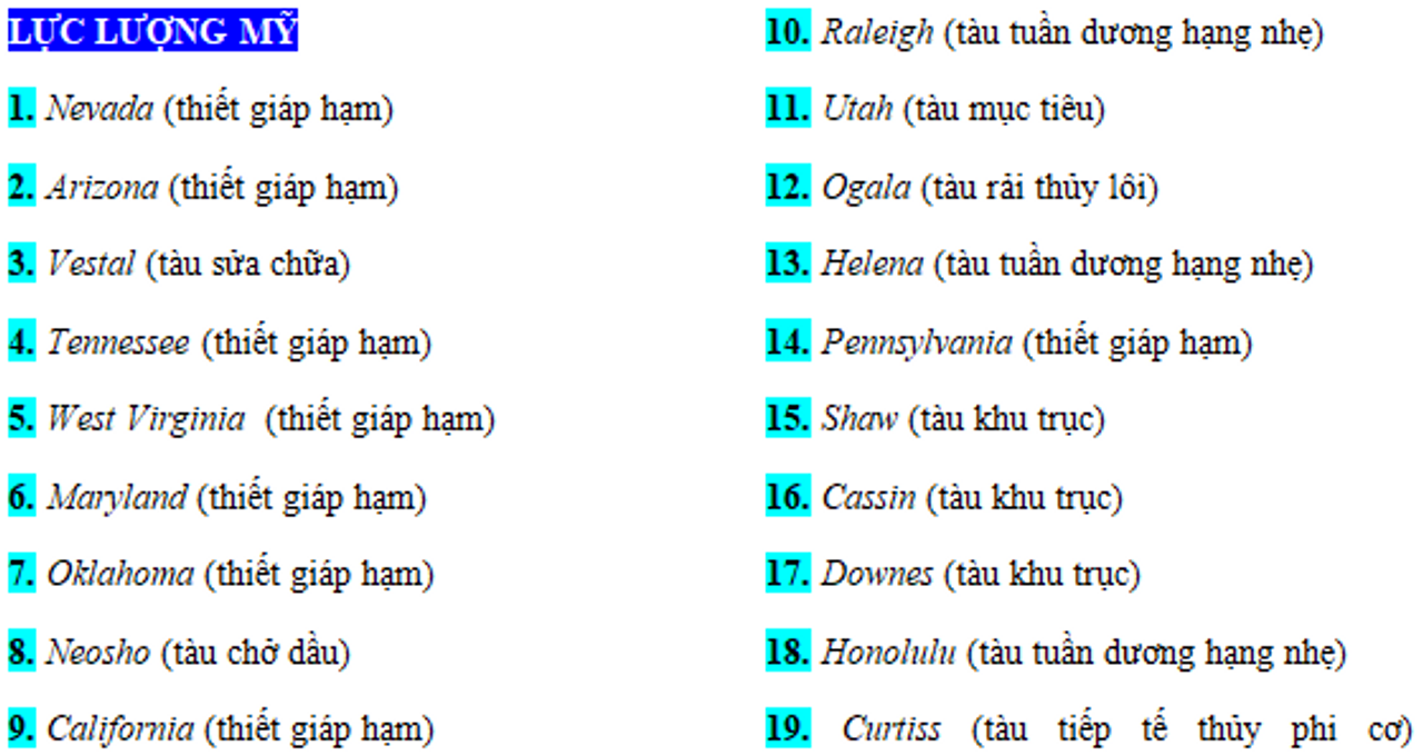 Bức ảnh này, chụp phía tây đảo Ford bởi một máy bay Type 97, cho thấy hậu quả sau các đòn tấn công ngư lôi của Nhật Bản. Từ trái sang phải là: tàu tuần dương hạng nhẹ Detroit, tàu tuần dương hạng nhẹ Raleigh (nghiêng sang mạn trái sau khi trúng một quả ngư lôi), tàu huấn luyện Utah (đã lật úp sau khi trúng hai ngư lôi) và tàu chở thủy phi cơ Tangier. (NHHC)