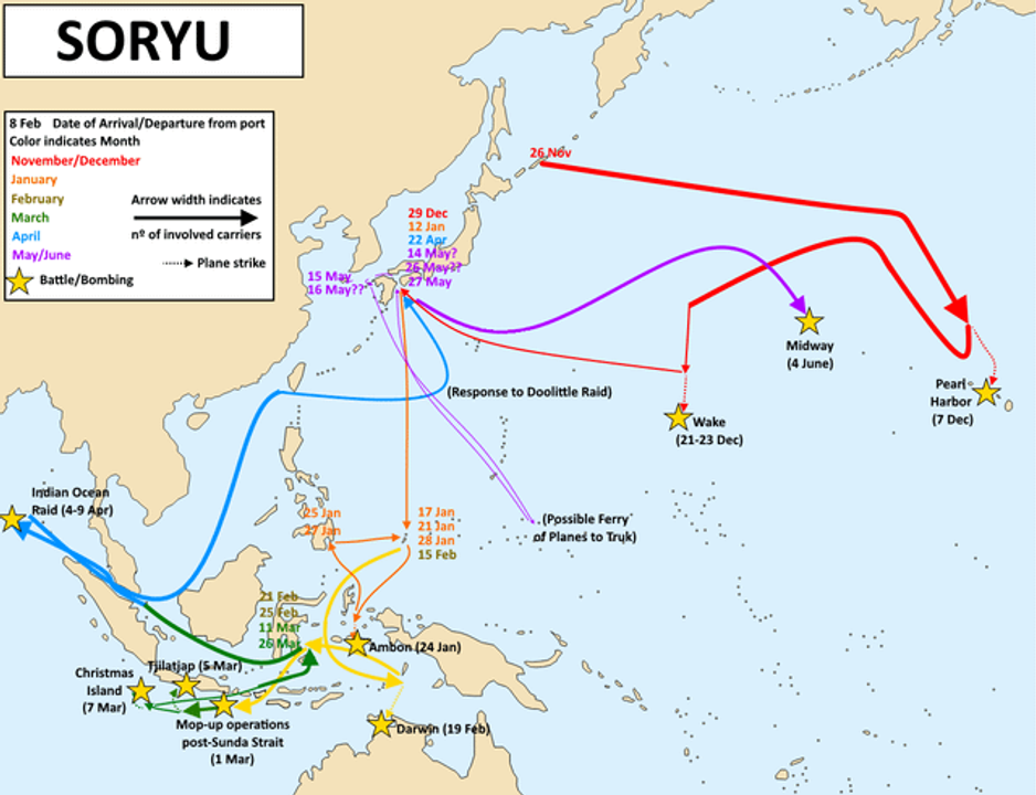 3. Soryu: Ngày 21 tháng 12 năm 1941, Soryu cùng với Hiryu được tách khỏi Kido Butai sau cuộc tấn công vào Trân Châu Cảng để hỗ trợ cuộc xâm lược đảo Wake lần thứ hai. Soryu đã thực hiện cuộc không kích đầu tiên gồm 18 máy bay ném bom bổ nhào và 18 máy bay tiêm kích. Ngày 22 tháng 12 năm 1941, con tàu thực hiện cuộc không kích thứ hai vào Wake với 18 máy bay Kate và 18 máy bay tiêm kích Zero, với thiệt hại là mất hai chiếc "Kate". Vào ngày 23 tháng 12, Soryu khởi hành về nước, và đến Kure vào ngày 29 để đại tu và tiếp tế. Vào ngày 11 tháng 1 năm 1942, Soryu trở lại biển, tiến đến Hashirajima trước khi hướng đến Palau và vào ngày 23 - 24 tháng 1 năm 1942, Hải đội Tàu sân bay số 2 đã phát động hai cuộc tấn công vào Ambon, để hỗ trợ cho cuộc đổ bộ Kendari trước khi tiến đến Davao, Mindanao. Sau đó, họ đã chuyển từ cuộc xâm lược quần đảo Palau và trận Ambon sang cuộc xâm lược Philippines, nhưng không tham gia vào cuộc tấn công này. Trong cuộc tấn công ban đầu của họ, Hải đội Tàu sân bay số 2 đã có thể đưa tổng cộng 52 máy bay lên không trung. Các tàu sân bay cũng đã tách ra 18 chiếc Zero và 9 chiếc D3A để hoạt động từ các căn cứ trên bộ, để hỗ trợ cho trận Borneo . Vào ngày 30 tháng 1, họ đã bắn hạ hai máy bay trên mặt đất và một thủy phi cơ Qantas Short Empire trên đường đến Surabaya. Ngày 28 tháng 1 năm 1942, Soryu có mặt tại Palau để tiếp tế và gặp Kaga, Akagi trước khi khởi hành vào ngày 15 tháng 2 năm 1942 đến Australia. Con tàu đã tham gia một cuộc không kích lớn vào cảng Darwin, nhưng thiệt hại ít ấn tượng hơn nhiều so với ở Trân Châu Cảng. Dù sao, Soryu đã đóng góp 18 chiếc B5N và 18 chiếc D3A, được hộ tống bởi 9 chiếc Zero, số còn lại ở lại trong nhóm CAP. Vào ngày 21 tháng 2, Soryu có mặt tại Vịnh Staring, Celebes, khởi hành để hỗ trợ cuộc xâm lược đảo Java, Trận Java . Vào ngày 5 tháng 3 năm 1942, Soryu và Hiryu đã mở cuộc tấn công vào Tjilatjap ở Java. Vào ngày 7 tháng 3 năm 1942, Hải đội Tàu sân bay số 2 đã mở cuộc tấn công vào đảo Christmas và vào ngày 11 tháng 3 năm 1942 đã quay trở lại Vịnh Staring để tiếp tế, sau đó khởi hành vào ngày 26 tháng 3 năm 1942 để gia nhập phần còn lại của hạm đội và tham gia vào chiến dịch lớn tiếp theo ở Ấn Độ Dương. Chiến dịch lớn này nhằm mục đích bảo vệ Miến Điện, Mã Lai và Đông Ấn Hà Lan mới được chinh phục, khiến bất kỳ cuộc phản công nào của Đồng minh từ đó là không thể xảy ra trong ít nhất vài tháng. Khởi hành vào ngày 26 tháng 3 năm 1942, năm tàu sân bay đã bị một chiếc Catalina phát hiện trên đường đi, cách Ceylon khoảng 350 hải lý (650 km) về phía đông nam. Vào ngày 5 tháng 4 năm 1942, Soryu đã phát động một cuộc tấn công từ 120 hải lý (220 km) vào Colombo (Ceylon). Các phi công của nó tuyên bố đã bắn hạ một chiếc Fairey Fulmar thuộc Phi đoàn Không lực Hải quân 806 và 7 máy bay tiêm kích khác. Cuối cùng, các máy bay D3A và B5N gây ra ít thiệt hại cho các cơ sở cảng vì sau khi cảnh báo được đưa ra, tất cả tàu thuyền trong cảng đều ở trên biển. Sau đó, máy bay trinh sát phát hiện ra HMS Cornwall và Dorsetshire, một lực lượng tấn công từ Sōryū gồm 18 chiếc D3A cất cánh, do Thiếu tá Egusa chỉ huy. Họ phát hiện ra hai tàu tuần dương và là những người đầu tiên giao chiến với chúng, tuyên bố đã thả bom trúng 14 phát vào cả hai tàu tuần dương hạng nặng. Chúng về sau bị các đợt không kích từ các tàu sân bay khác kết liễu. Vào ngày 9 tháng 4 năm 1942, Soryu phát động cuộc tấn công thứ hai được lên kế hoạch để tấn công Trincomalee. Máy bay B5N của Soryu là những chiếc đầu tiên bay qua cảng trong khi các máy bay chiến đấu không gặp phải sự kháng cự nào và thay vào đó bắt đầu bắn phá các cơ sở. Trong khi đó, một thủy phi cơ từ thiết giáp hạm Haruna phát hiện ra HMS Hermes, được hộ tống bởi tàu khu trục HMAS Vampire của Úc. Ngay khi chúng sẵn sàng, mọi chiếc D3A có sẵn đều được phóng lên và một lần nữa, phi đội của Sōryū bao gồm 18 máy bay ném bom bổ nhào nhưng chúng đến quá muộn vì con tàu đã bị các đợt không kích khác đuổi kịp và đánh chìm. Thay vào đó, phi đội này phát hiện ra ba tàu khác ở xa hơn về phía bắc, tàu chở dầu Anh Sergeant và tàu chở hàng Na Uy Norviken. Cả hai đều bị đánh chìm. Tuy nhiên, do gần bờ biển, họ đã được báo động và bị tám chiếc máy bay Fulmar từ Phi đoàn Không lực Hải quân 803 và 806 tấn công. Họ tuyên bố đã bắn hạ 2 chiếc Fulmar và chỉ để mất 3 chiếc D3A, trong khi thực tế phi đội của Sōryū mất 4 chiếc D3A, 5 chiếc bị hư hại. Trong cuộc đột kích của các máy bay ném bom Bristol Blenheim của Anh từ Ceylon, Sōryū đã đóng góp vào hoạt động CAP với sáu chiếc Zero trong số mười bốn chiếc tham gia bắn hạ năm chiếc máy bay Blenheim và chỉ để mất chiếc Zero từ Hiryū. Kido Butai sau đó quay đầu về hướng đông nam (eo biển Malacca) để thu hồi các nhóm không quân ở giữa