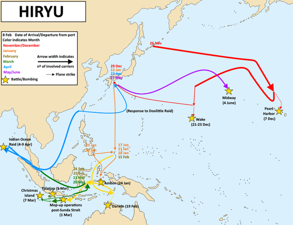 4. Hiryu: con tàu đã cùng Soryu thực hiện các đợt không kích vào Trân Châu Cảng. Trên đường trở về Nhật Bản, Nagumo ra lệnh cho Hiryū cùng Soryu tách ra khỏi Kido Butai vào ngày 16 tháng 12 để tấn công đảo Wake. Họ đến vào ngày 21 tháng 12, phóng 29 chiếc D3A và 2 chiếc B5N được hộ tống bởi 18 chiếc Zero kết hợp thành một đợt đầu tiên. Không có sự kháng cự trên đáng kể nào, họ đã phóng một đợt thứ hai gồm 35 chiếc B5N và 6 chiếc A6M Zero vào ngày hôm sau, nhưng lại bị chặn lại bởi hai chiếc F4F Wildcats còn sống sót từ VMF-211 và 2 chiếc B5N bị chúng bắn hạ. Quân đồn trú trên đảo Wake đã đầu hàng sau đó khi cuộc đổ bộ được thực hiện. Cả hai tàu sân bay đã trở lại Kure vào ngày 29 tháng 12, được phân công cho Lực lượng phía Nam (ngày 8 tháng 1 năm 1942), sau đó khởi hành đến Đông Ấn thuộc Hà Lan. Họ đã yểm trợ cho cuộc xâm lược quần đảo Palau và trận Ambon, tham gia oanh tạc và ném bom các vị trí của quân Đồng minh vào ngày 24 tháng 1 năm 1942, với 54 máy bay thực hiện các phi vụ suốt ngày đêm. Bốn ngày sau, họ tách ra từ 18 chiếc Zero và 9 chiếc D3A hạ cánh để hoạt động từ các căn cứ trên bộ cho chiến dịch tiếp theo - trận Borneo . Hiryū đã trở lại Palaus vào ngày 28 tháng 1, chờ đợi Hải đội Tàu sân bay số 1. Cả bốn tàu sân bay của Hải đội 1 và 2 đều khởi hành vào ngày 15 tháng 2 đến một vị trí lý tưởng để phát động cuộc đột kích nổi tiếng vào Darwin. Về phần mình, Hiryū đã phóng 18 chiếc B5N, 18 chiếc D3A, được hộ tống bởi 9 chiếc Zero. Các máy bay tiêm kích của con tàu đã tuyên bố bắn hạ một chiếc P-40E duy nhất khi nó đang cất cánh và hai chiếc Consolidated PBY Catalina trên mặt nước, nhưng con tàu cũng mất một chiếc Zero do một chiếc P-40E thuộc Phi đoàn Truy kích 33 của Không quân Hoa Kỳ bắn hạ. Tiếp theo, Hiryū đến Vịnh Staring thuộc đảo Celebes, vào ngày 21 tháng 2 để tiếp tế. Họ khởi hành bốn ngày sau đó để hỗ trợ cuộc xâm lược Java . Vào ngày 1 tháng 3 năm 1942, các máy bay D3A của Hiryu đã gây hư hại cho tàu khu trục USS Edsall, sau đó bị các tàu tuần dương Nhật Bản kết liễu. Các máy bay ném bom bổ nhào của con tàu đã đánh chìm tàu chở dầu USS Pecos và gia nhập vào lực lượng 180 máy bay để không kích Tjilatjap vào ngày 5 tháng 3. Vào ngày 7 tháng 3, con tàu tham gia tấn công Đảo Christmas. Máy bay của Hiryū đã đánh chìm tàu chở hàng Hà Lan Poelau Bras. Sau đó, họ tiếp tế tại vịnh Staring vào ngày 11 tháng 3 để chuẩn bị cho chiến dịch lớn tiếp theo - cuộc không kích Ấn Độ Dương. Vào ngày 26 tháng 3, Kido Butai khởi hành từ vịnh Staring, và họ bị một chiếc Catalina của Anh phát hiện, ở vị trí cách Ceylon 350 hải lý về phía đông nam lúc sáng sớm ngày 4 tháng 4. Đối với cuộc tấn công vào Colombo, Hiryū đã cho cất cánh 18 chiếc B5N được hộ tống bởi 9 chiếc Zero, gặp nhau tại mục tiêu của họ là 6 máy bay ném bom ngư lôi Fairey Swordfish (788 NAS) đang trên đường tấn công hạm đội. Tất cả chúng đều bị bắn hạ. Sau đó, lực lượng này đã bắt gặp các máy bay Hawker Hurricanes trên sân bay Ratmalana. Các máy bay Zero của Hiryū đã tiêu diệt không dưới 11 chiếc, chỉ có 3 chiếc Zero bị hư hại nhưng điều này trái ngược với tuyên bố của Anh. Tổng thiệt hại là 21 chiếc Hurricane bị bắn hạ, 2 chiếc khác bị rơi khi hạ cánh. Các máy bay D3A và B5N đã gây thiệt hại cho cảng nhưng không thể đánh chìm phần lớn tàu bè, vốn đã rời đi sau khi có báo động. Các máy bay Zero của lực lượng CAP của Hiryū đã tiêu diệt một chiếc Catalina khác của RAF, một chiếc Fairey Albacore và đẩy lùi một phi đội từ HMS Indomitable. Cornwall và Dorsetshire sau đó đã bị phát hiện và 18 chiếc D3A của Hiryū kết hợp với những chiếc của ba tàu sân bay khác đã đánh chìm cả hai. Vào ngày 9 tháng 4, CAP của Hiryū đã tiêu diệt chiếc Catalina thứ ba của họ, bị bắt khi đang tìm kiếm Nagumo. Sau đó, một đợt 18 chiếc B5N được hộ tống bởi 6 chiếc Zero cất cánh từ sàn bay của tàu để tấn công Trincomalee. Trong khi đó, thủy phi cơ của Haruna đang tuần tra đã phát hiện ra HMS Hermes và tàu hộ tống HMAS Vampire của nó. Tất cả các máy bay D3A có sẵn đã cất cánh được hộ tống bởi 9 chiếc Zero, bao gồm 18 chiếc từ Hiryū. Họ đã đến quá muộn (lúc đó chúng đã bị đánh chìm) nhưng khi tìm thấy xa hơn về phía bắc thì phát hiện tàu chở hàng RFA Athelstone và tàu hộ tống HMS Hollyhock, cả hai đều bị đánh chìm. Trong khi đó thì hạm đội của Nagumo bị một phi đội gồm 9 chiếc Blenheim tấn công, Akagi trở thành mục tiêu và cố gắng né tránh bom. Những chiếc này đến từ Ceylon và thả bom từ độ cao 3.400 m (11.000 feet). Hiryū đã điều động thêm 12 chiếc Zero của CAP để đánh chặn chúng, bắn rơi năm chiếc, và chỉ có một chiếc Zero của Hiryū bị bắn hạ. Sau khi hoàn thành nhiệm vụ, Nagumo ra lệnh cho Hạm đội Không quân số 1 hướng về phía đông nam, đến eo biển Malacca, để trở về nhà. Vào 