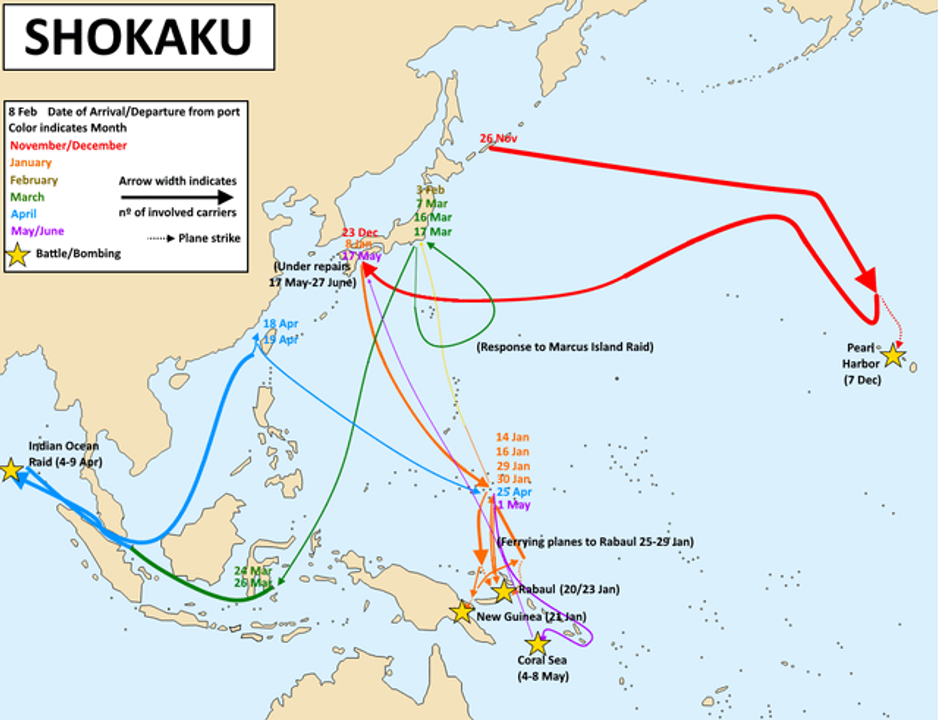 5. Shokaku: con tàu là thành phần của Hải đội Tàu sân bay số 5 trong lực lượng tham gia tấn công Trân Châu Cảng. Shokaku về đến và ở lại Hashirajima vào ngày 23 tháng 12 năm 1941. Sau đó, con tàu đi đến Kure, rồi dừng chân tại Saeki. Nó được đưa vào ụ tàu khô và trải qua năm mới tại đây, rời ụ tàu vào ngày 3 tháng 1 năm 1942, trước khi hướng đến Vịnh Hiroshima cùng với Zuikaku. Ngày 7 tháng 1 năm 1942, cả hai tàu khởi hành đến Truk cùng Kido Butai của Nagumo và khởi hành lại vào ngày 16 tháng 1 năm 1942 để tham gia Chiến dịch "R" (ngày 14 - 24 tháng 1). Ngày 20 tháng 1 năm 1942, một cuộc tấn công quy mô lớn đầu tiên với sự tham gia của 90 máy bay đã được phát động chống lại Rabaul, Shokaku đã đóng góp 19 máy bay ném bom bổ nhào "Val" và rút lui mà không bị tổn thất. Ngày 21 tháng 1 năm 1942, Hải đội Tàu sân bay số 5 được tách ra để tiến hành các cuộc không kích riêng biệt vào các sân bay ở các địa điểm là Lae, Salamaua, Bulolo và Madang. Ngày 25 tháng 1, cách Truk khoảng 160 km về phía nam, Shokaku đã đưa 16 máy bay tiêm kích Mitsubishi A5M "Claude" từ Chitose lên tàu để lấp đầy một sân bay địa phương được tái chiếm tại Rabaul trước khi tiếp tục đến Truk cho đến tận ngày 29. Đến ngày 30, Shokaku khởi hành đi đến Yokosuka. Tại đây, nó nhận máy bay từ quê nhà. Vào ngày 3 tháng 2, nó ở Yokosuka, được huấn luyện tại vùng biển địa phương và luân phiên đến vịnh Tateyama, vịnh Shirako, vịnh Mikawa cho đến ngày 24 tháng 2, rồi quay trở lại Yokosuka để vào ụ tàu khô cho đến ngày 5 tháng 3 năm 1942. Hai ngày sau, nó khởi hành để đánh chặn Lực lượng Đặc nhiệm 16 của tàu sân bay Enterprise sau cuộc đột kích đảo Marcus, nhưng vô ích vì không tìm thấy tàu đối phương. Vào ngày 11 tháng 3, Shokaku cùng với Zuikaku cho một phi vụ đánh chặn một lực lượng Mỹ đang tiến về phía bờ biển Nhật Bản. Nhưng không có liên lạc nào được thực hiện và lực lượng này đã rút lui đến Yokosuka vào ngày 16 tháng 3 năm 1942, sau đó Shokaku đến Vịnh Staring để tham gia Chiến dịch "C", đến Ấn Độ Dương vào ngày 24 tháng 3. Ngày 3 tháng 4 năm 1942, Shokaku đã phát động cuộc tấn công gồm 18 máy bay Kate được hộ tống bởi 10 máy bay tiêm kích Zero vào Trincomalee ở Ceylon. Trong khi đó, 18 máy bay ném bom bổ nhào "Val" đã đánh chìm Hermes, và không đoàn của con tàu tuyên bố đã đánh bom trúng 13 trong số 40 phát được báo cáo. Shokaku sau đó đã khởi hành từ Truk để tham gia vào Chiến dịch MO và chạm trán với lực lượng tàu sân bay Mỹ tại Biển San Hô (sẽ mô tả kỹ ở phần 3). Con tàu cùng với Zuikaku đã góp phần đánh chìm USS Lexington nhưng bản thân con tàu cũng các máy bay Mỹ đánh hư hỏng nặng tới mức buộc con tàu phải trở về Kure vào ngày 17 tháng 5 năm 1942 để sửa chữa. Đó cũng là lý do con tàu đã không góp mặt cùng Kido Butai tấn công Midway vào tháng 6 năm 1942.