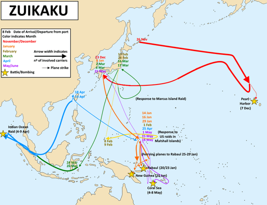 6. Zuikaku: Cùng với Shokaku, Zuikaku đã tấn công các căn cứ của Úc tại Rabaul (Chiến dịch "R") vào ngày 20 tháng 1 năm 1942, và Lae-Salamaua (New Guinea) vào ngày hôm sau. Sau đó, nó xuất phát từ Yokosuka vào ngày 16 tháng 2 năm 1942 để chiếm giữ vị trí phòng thủ tại khu vực vịnh Mikawa, sẵn sàng đánh chặn các tàu sân bay Mỹ nếu chúng tiếp cận, và giữ nguyên vị trí này cho đến ngày 28. Cùng ngày hôm đó, nó quay trở lại Suzuka ở Nhật Bản để bắt đầu huấn luyện không đoàn tại đây. Sau khi dừng chân tại Kure, nó đã thực hiện một cuộc càn quét tại Minami-Torishima (đảo Marcus) để tìm kiếm Lực lượng Đặc nhiệm 16, nhưng không có kết quả. Con tàu đã thực hiện một cuộc càn quét khác vào ngày 11 tháng 3 năm 1942 cùng với tàu chị em của mình để đánh chặn một lực lượng Mỹ được cho là đang tiến đến nhưng không phát hiện được gì. Vào tháng 4 năm 1942, con tàu cũng tham gia vào cuộc đột kích Ấn Độ Dương (Chiến dịch C) với các cuộc không kích Colombo và Trincomalee, Ceylon, tham gia đánh chìm HMS Cornwall, Dorsetshire và tàu sân bay HMS Hermes. Khi Kido Butai quay trở lại vào ngày 10 tháng 4 năm 1942 tại Thái Bình Dương, Yamamoto quyết định cho tách ra Hải đội Tàu sân bay 5 ra khỏi Kido Butai tham gia Chiến dịch MO nhằm xâm lược Port Moresby ở New Guinea, bắt đầu vào ngày 12 tháng 4. Về sau điều đó sẽ dẫn đến việc con tàu cùng với Shokaku tham gia vào trận chiến tàu sân bay đầu tiên tại Biển San Hô. Sau trận đánh, Zuikaku tuy không bị hư hại gì nhưng nhóm không quân của con tàu đã bị hao mòn nặng tới mức mà bắt buộc phải ở lại quê nhà để huấn luyện tái xây dựng lại sức mạnh của mình. Con tàu cùng Shokaku đều không tham gia chiến dịch Midway cũng vì lý do này.