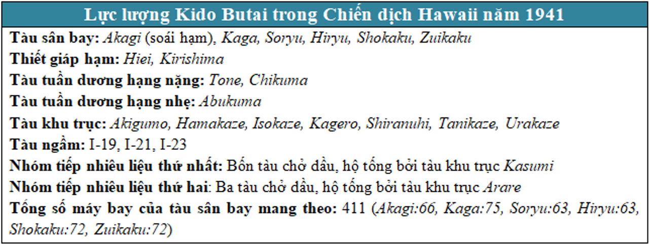 Phần này sẽ mô tả ngắn gọn về hoạt động của sáu tàu sân bay hạm đội của Kido Butai. Nếu để ý thì ta sẽ biết rằng chiến dịch tấn công Trân Châu Cảng là lần duy nhất mà Kido Butai tập hợp đủ cả sáu tàu sân bay hạm đội và có đầy đủ sức mạnh nhất. Và sau chiến dịch thì các tàu sân bay trong lực lượng đã tách ra để tham gia hỗ trợ các lực lượng hải quân khác trong quá trình bành trướng trên Thái Bình Dương. Các chiến dịch lớn sau Trân Châu Cảng đều chỉ tập hợp từ 4 - 5 tàu sân bay do một số tàu được điều đi tham chiến ở nơi khác hoặc là bị hư hại, hao mòn trong chiến đấu. Điều này sẽ được nhắc tới ở trận Biển San Hô và Midway ở phần sau. (Ảnh từ Word War Two Channel trên Reddit; nguồn thông tin từ trang Naval encyclopedia.com)