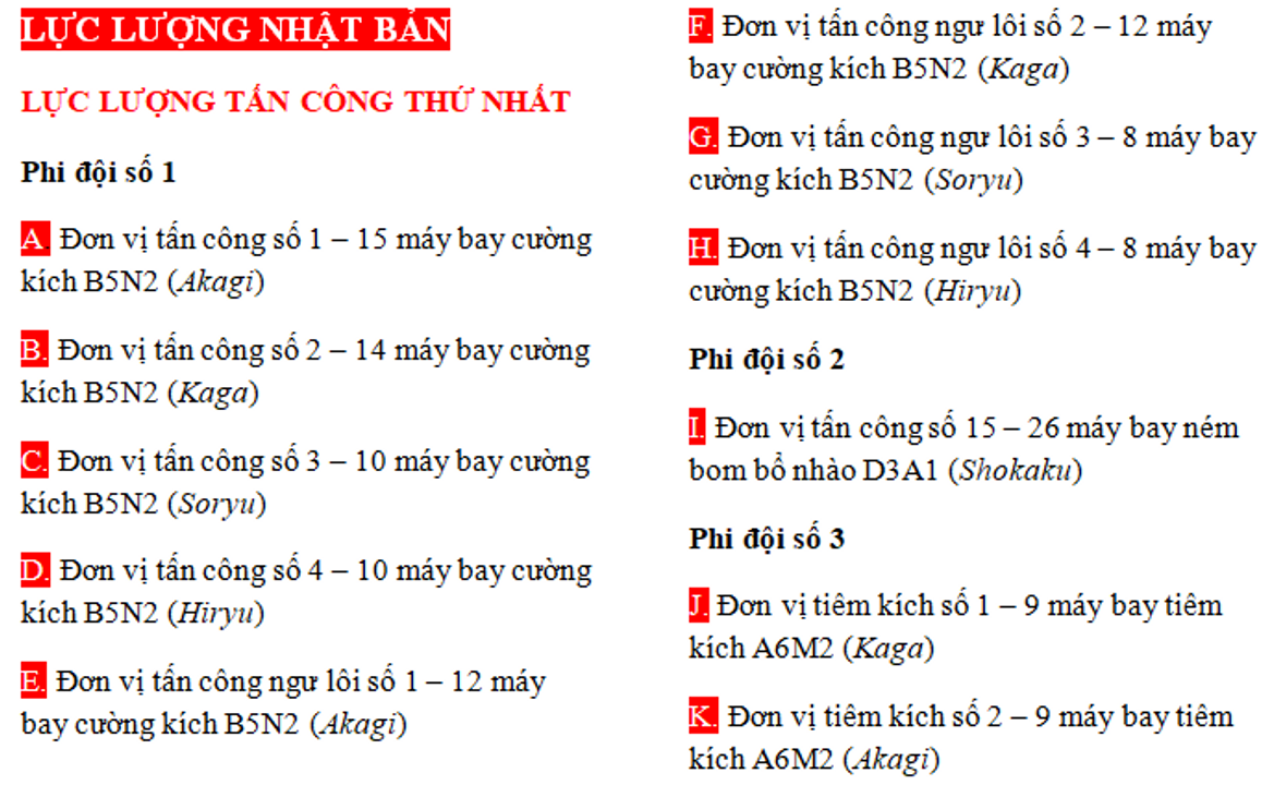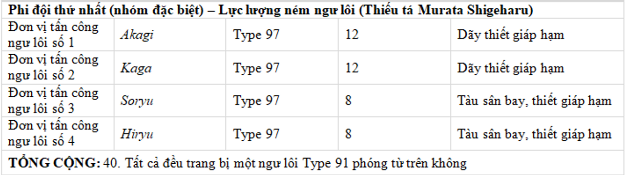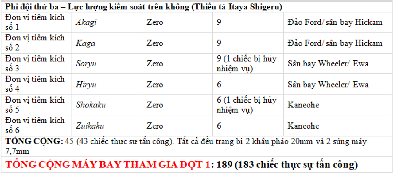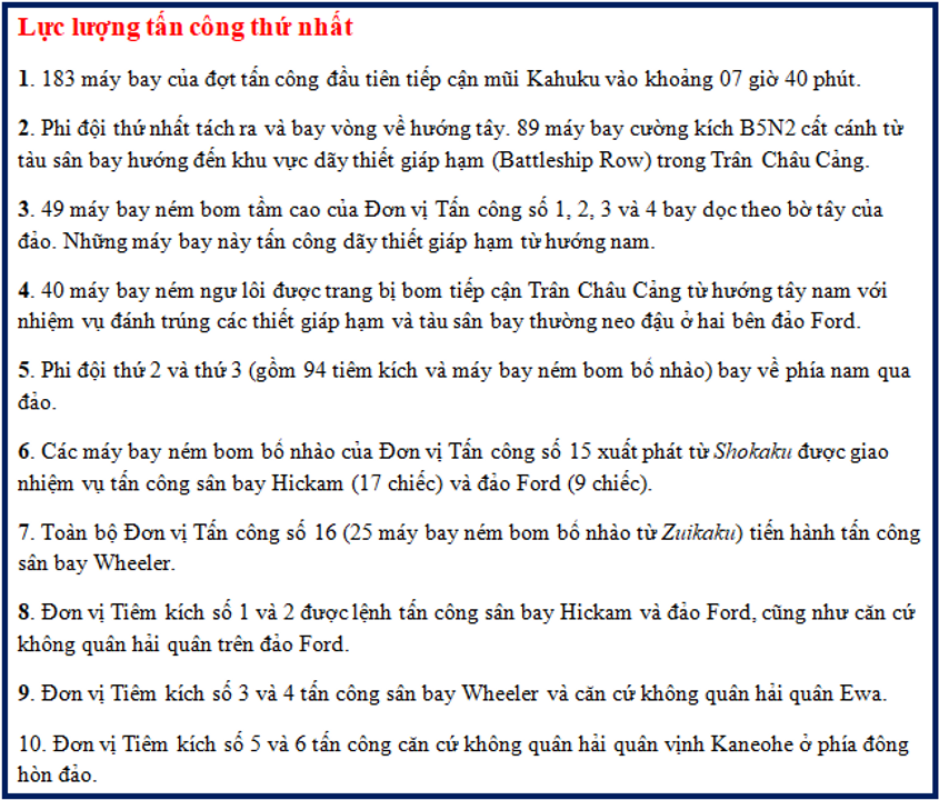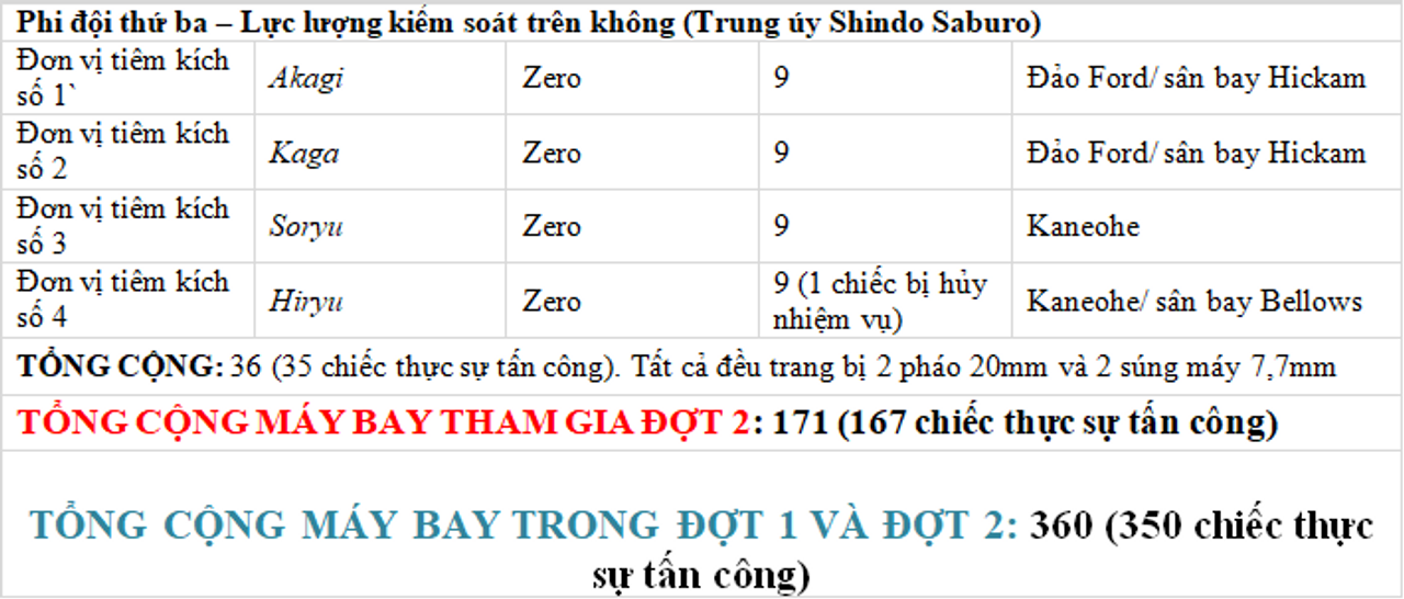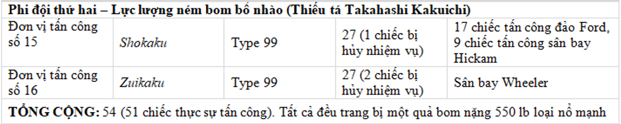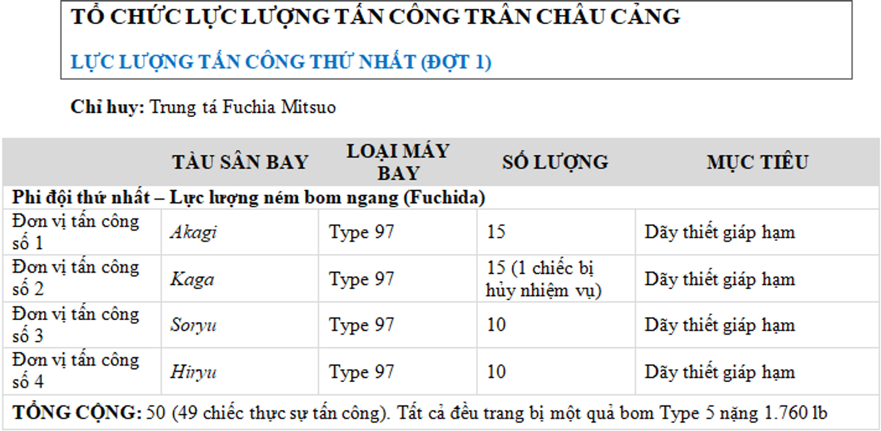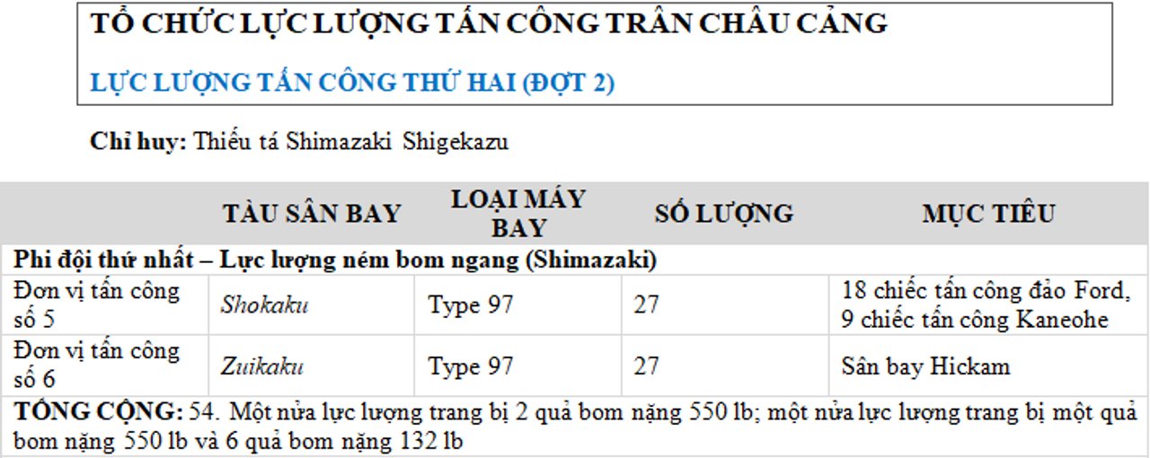 Bảng dưới đây trình bày cách Nagumo và bộ tham mưu của ông tổ chức cuộc tấn công. Ở đợt tấn công đầu tiên, những phi đội tinh nhuệ của các Hải đội Tàu sân bay số 1 và 2 được giao nhiệm vụ tiêu diệt các thiết giáp hạm và tàu sân bay đang neo đậu quanh đảo Ford bằng 40 máy bay ném ngư lôi và 50 máy bay ném bom ngang. Những phi công thiếu kinh nghiệm của Hải đội Tàu sân bay số 5 được sử dụng để tấn công các căn cứ tại đảo Ford, sân bay Hickam và Kaneohe nhằm làm tê liệt sức mạnh không quân Mỹ. Đợt tấn công thứ hai sẽ đến ngay sau đợt đầu tiên, nhằm khiến người Mỹ không có thời gian phục hồi. Đợt này không có máy bay thả ngư lôi dễ bị tổn thương, vì yếu tố bất ngờ đã không còn. 54 máy bay ném bom ngang được giao nhiệm vụ tấn công các sân bay trọng yếu để hoàn tất việc tiêu diệt lực lượng không quân Mỹ. Trọng tâm của đợt tấn công thứ hai là 81 máy bay ném bom bổ nhào tinh nhuệ từ Hải đội Tàu sân bay số 1 và 2. Mục tiêu chính của chúng là các tàu sân bay bị hư hại từ đợt đầu tiên. Các máy bay ném bom bổ nhào được lệnh tiêu diệt hoàn toàn những mục tiêu này để đảm bảo không thể cứu vãn hay trục vớt được.