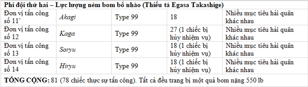 Máy bay ném bom bổ nhào cũng đóng vai trò quan trọng trong cuộc tấn công, vì quả bom nặng 550 pound của chúng có thể xuyên thủng lớp giáp ngang của các tàu sân bay và tàu tuần dương vốn được bọc giáp nhẹ. Trong các đợt huấn luyện vào nửa sau năm 1941, tỷ lệ chính xác của ném bom bổ nhào đạt từ 50 - 60%. Để tăng độ chính xác, điểm thả bom của máy bay ném bom bổ nhào được hạ xuống chỉ dưới 1.500 feet.