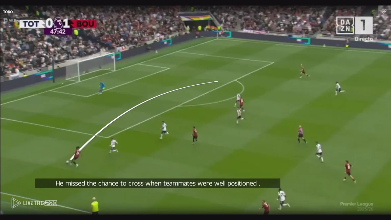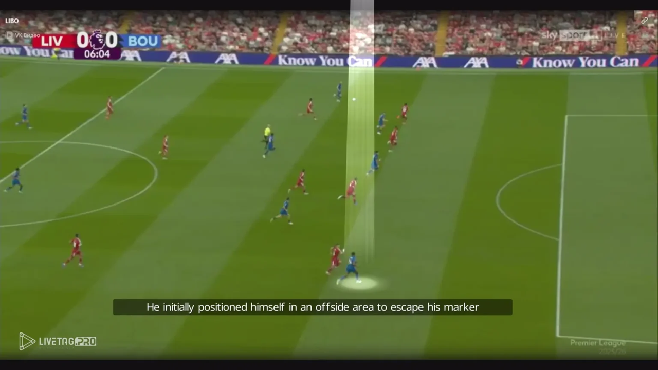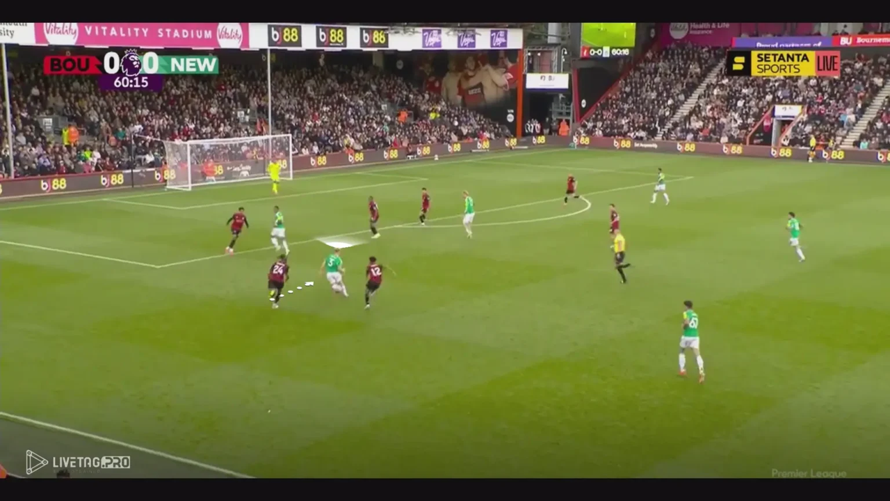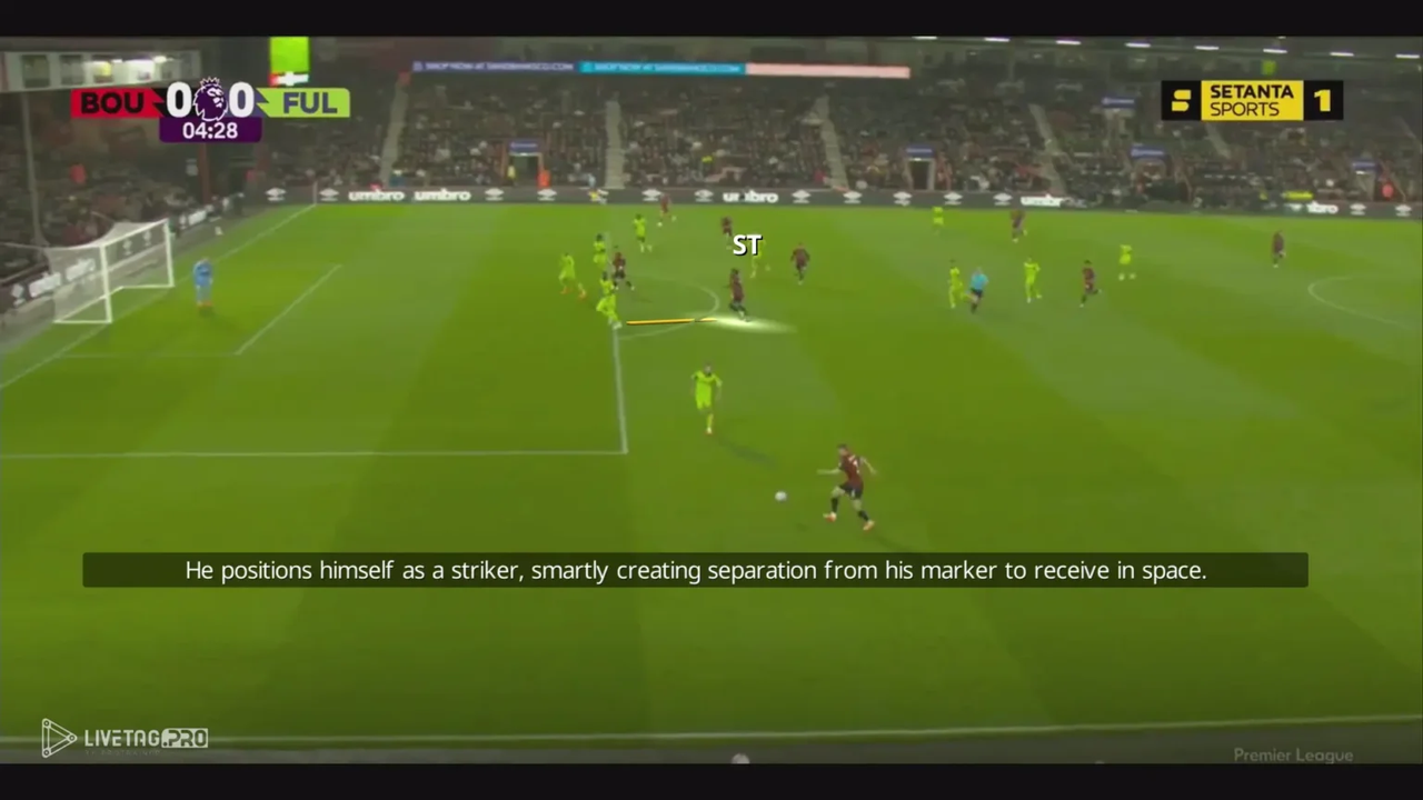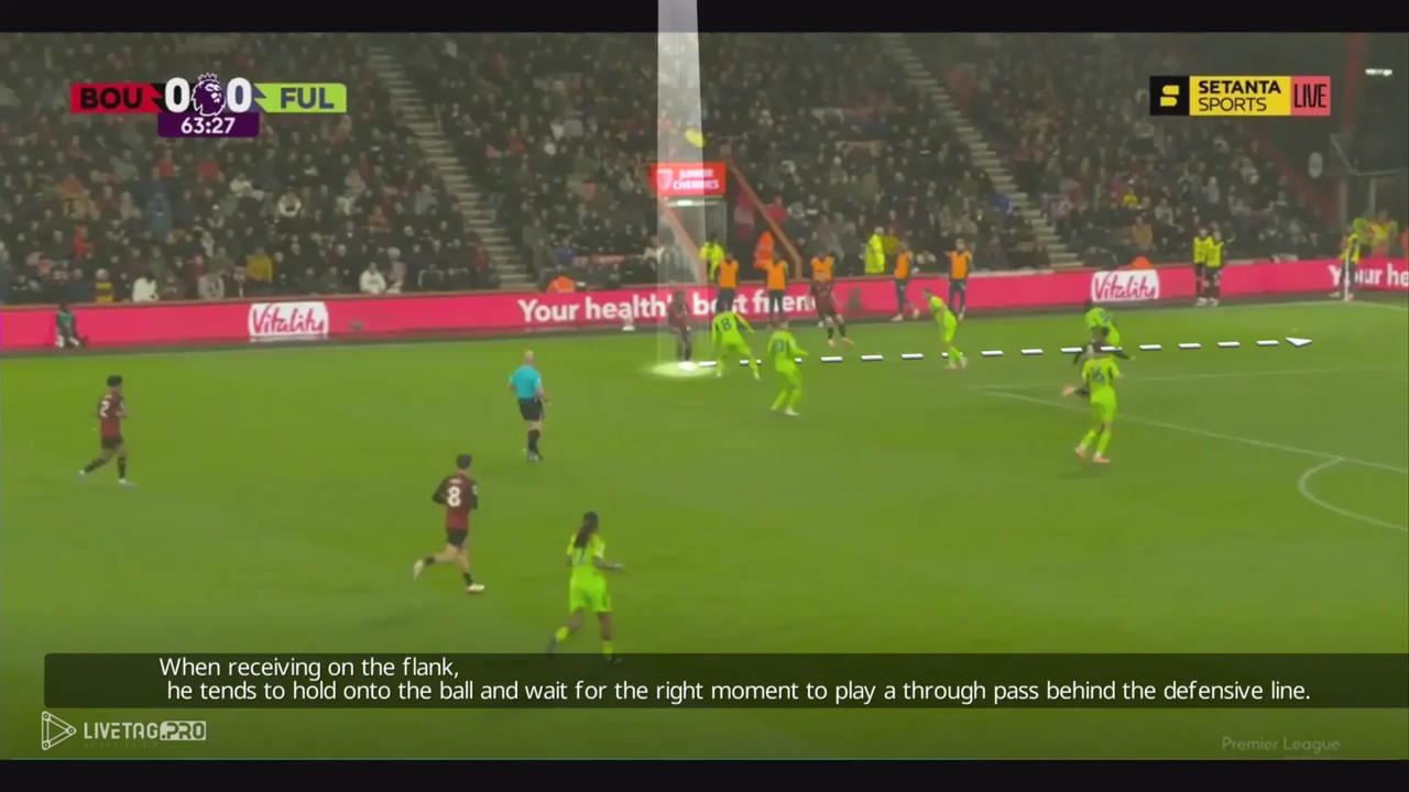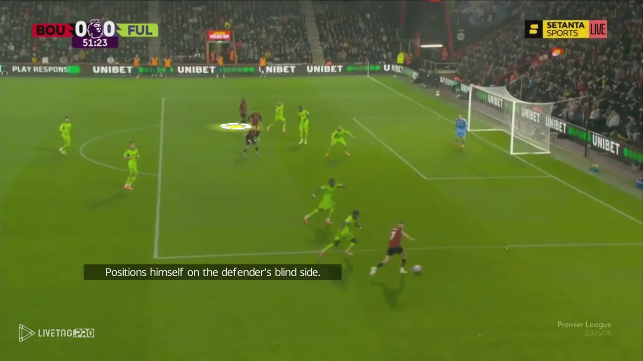 Một khía cạnh tinh tế nhưng hiệu quả khác trong cách chọn vị trí của anh là thỉnh thoảng cố tình đứng ở thế việt vị khi Bournemouth đang kiểm soát bóng. Bằng cách trì hoãn pha di chuyển và canh thời điểm băng lên khi bóng được đẩy lên tuyến trên, anh vẫn giữ được vị trí trước hậu vệ kèm mình nhưng kịp thời trở lại thế hợp lệ, một chiến thuật khôn ngoan giúp anh tạo khoảng cách so với hậu vệ và tấn công vào khoảng trống với đà di chuyển mạnh mẽ.
